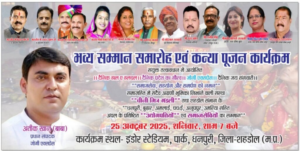 धनपुरी में 25 अक्टूबर का यह आयोजन समाजसेवा, धर्म, और मानवता का अद्भुत संगम बनने जा रहा है। अतीक खान (बाबा) द्वारा आयोजित यह कार्यक्रम निश्चित रूप से शहडोल जिले ही नहीं, पूरे प्रदेश में एक नई मिसाल कायम करेगा , जहाँ सम्मान, सेवा और संस्कार की त्रिवेणी बहती दिखाई देगी, जो समाज के लिए जीता है, वही सच्चा नायक है। अतीक खान (बाबा)