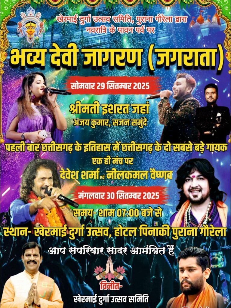 जीपीएम – नगर गौरेला के होटल पिनाकी इन परिसर में सिद्ध श्री खेरमाई दुर्गा उत्सव समिति पुराना गौरेला द्वारा भारत की सुप्रसिद्ध भजन गायक श्रीमती इशरत जहां (मुंबई) का दिनांक 29 सितंबर सोमवार को भव्य जगराता कार्यक्रम आयोजित किया गया है।
