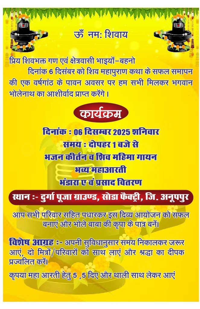 अमलाई। नगर परिषद बरगवां अमलाई अंतर्गत गांधीनगर, सोडा फैक्ट्री दुर्गा पूजा ग्राउंड में शिवभक्तों में उत्साह का माहौल है, क्योंकि 6 दिसंबर 2025, शनिवार को शिव महापुराण कथा के सफल समापन के उपलक्ष्य में एक दिव्य धार्मिक आयोजन रखा गया है। यह आयोजन भगवान भोलेनाथ की महिमा व भक्ति को जन-जन तक पहुंचाने का एक पावन प्रयास माना जा रहा है, जिसमें क्षेत्रभर से श्रद्धालुओं के बड़ी संख्या में पहुंचने की अपेक्षा है।