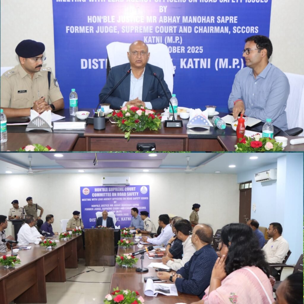 कटनी।। पुलिस कंट्रोल रूम में सड़क सुरक्षा विषय पर एक महत्वपूर्ण रिव्यू मीटिंग का आयोजन किया गया। इस बैठक की अध्यक्षता माननीय सर्वोच्च न्यायालय के पूर्व न्यायाधीश एवं सुप्रीम कोर्ट कमेटी ऑन रोड सेफ्टी (SCCORS) के अध्यक्ष अभय मनोहर सप्रे ने की। बैठक की शुरुआत जिला कलेक्टर आशीष तिवारी एवं पुलिस अधीक्षक अभिनय विश्वकर्मा द्वारा पुष्पगुच्छ भेंट कर माननीय पूर्व न्यायाधीश का स्वागत करने से हुई। इस अवसर पर एडीएम प्रमोद चतुर्वेदी, अतिरिक्त पुलिस अधीक्षक संतोष डेहरिया, नगर निगम डिप्टी कमिश्नर शैलेष गुप्ता, पीडब्ल्यूडी अधिकारी श्रीमति शारदा सिंह, एनएचएआई अधिकारी हेमंत सिंह, आरटीओ संतोष पाल सहित पुलिस और प्रशासन के वरिष्ठ अधिकारी, ट्रैफिक पुलिस स्टाफ एवं अन्य विभागों के प्रतिनिधि उपस्थित रहे।
