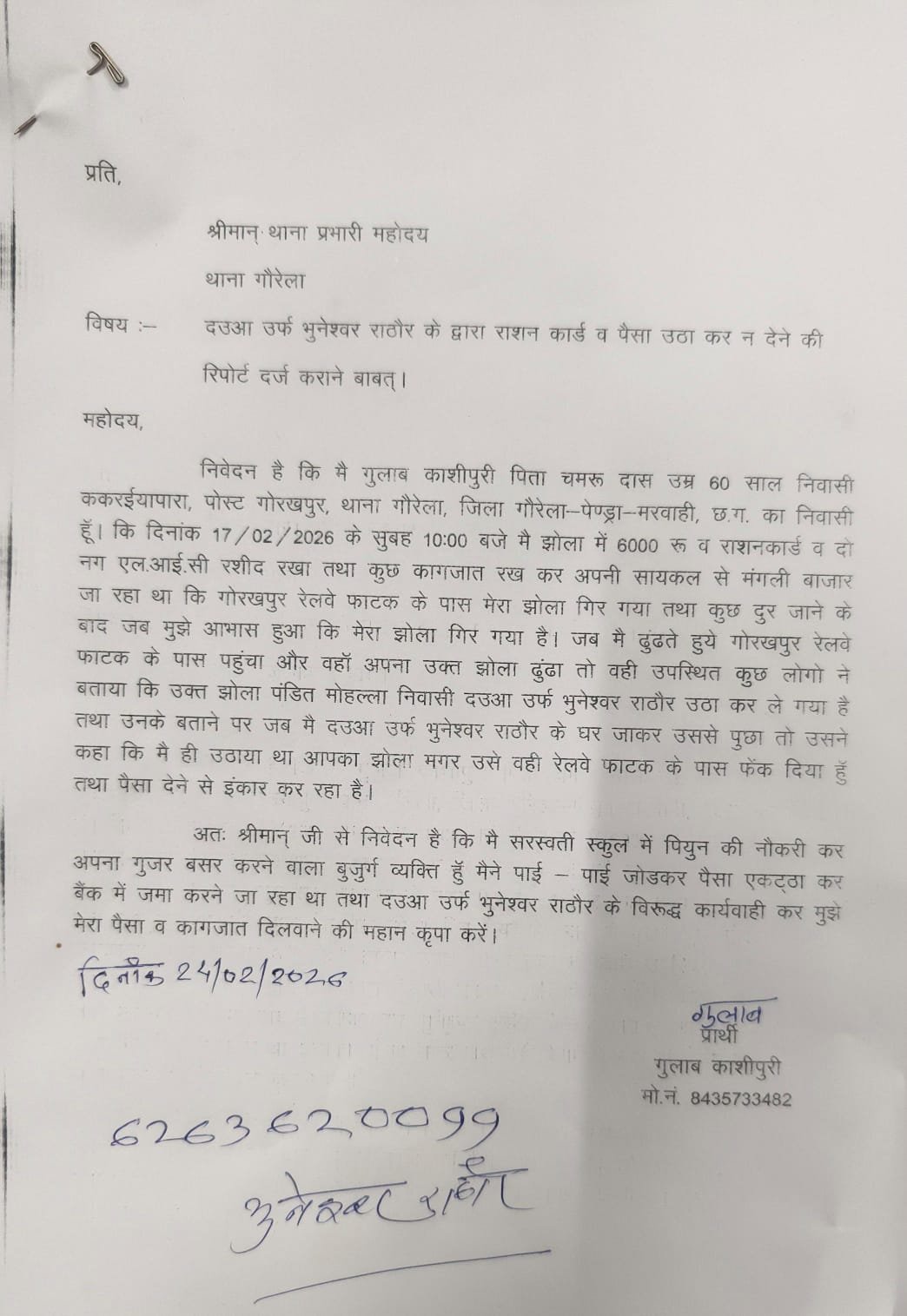 इस अहम खुलासे के बाद पीड़ित गुलाब दास पनिका ने अपना आधिकारिक कथन दर्ज कराया है और पुलिस प्रशासन से मांग की है कि उक्त संदेही से पूछताछ कर उनके 6000 रुपये और सभी महत्वपूर्ण दस्तावेजों को जल्द से जल्द बरामद किया जाए।