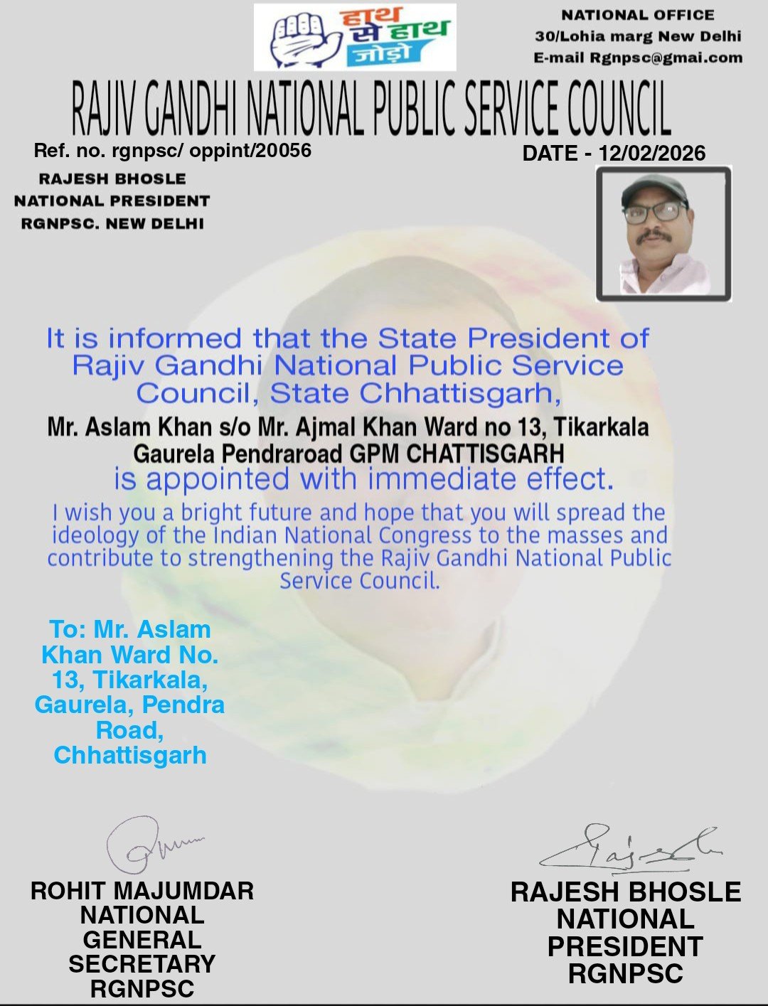जीपीएम – राजीव गांधी राष्ट्रीय लोक सेवा परिषद नई दिल्ली के राष्ट्रीय अध्यक्ष श्री राजेश भोंसले एवं राष्ट्रीय महासचिव श्री रोहित मजूमदार ने आज अपने संगठन का विस्तार करते हुए छत्तीसगढ़ राज्य में प्रदेश अध्यक्ष पद पर श्री असलम खान को नियुक्त कर शुभकामनाएं दी हैं।
