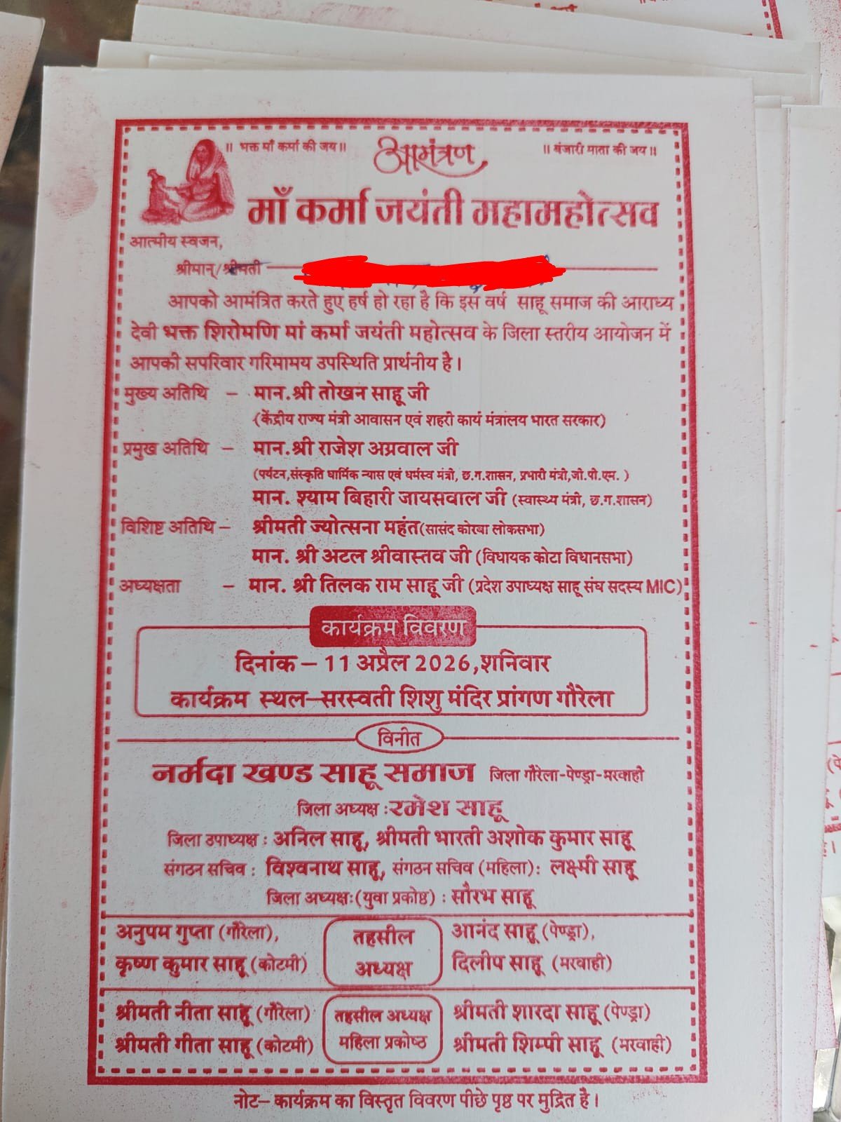 गौरेला: साहू समाज गौरेला द्वारा कल, दिनांक 11 अप्रैल 2026 (शनिवार) को ‘भक्त माता कर्मा जयंती’ का आयोजन पूरी भव्यता और हर्षोल्लास के साथ किया जा रहा है। इस पावन अवसर को ऐतिहासिक और गरिमामय बनाने के लिए समाज द्वारा व्यापक स्तर पर तैयारियां की गई हैं।