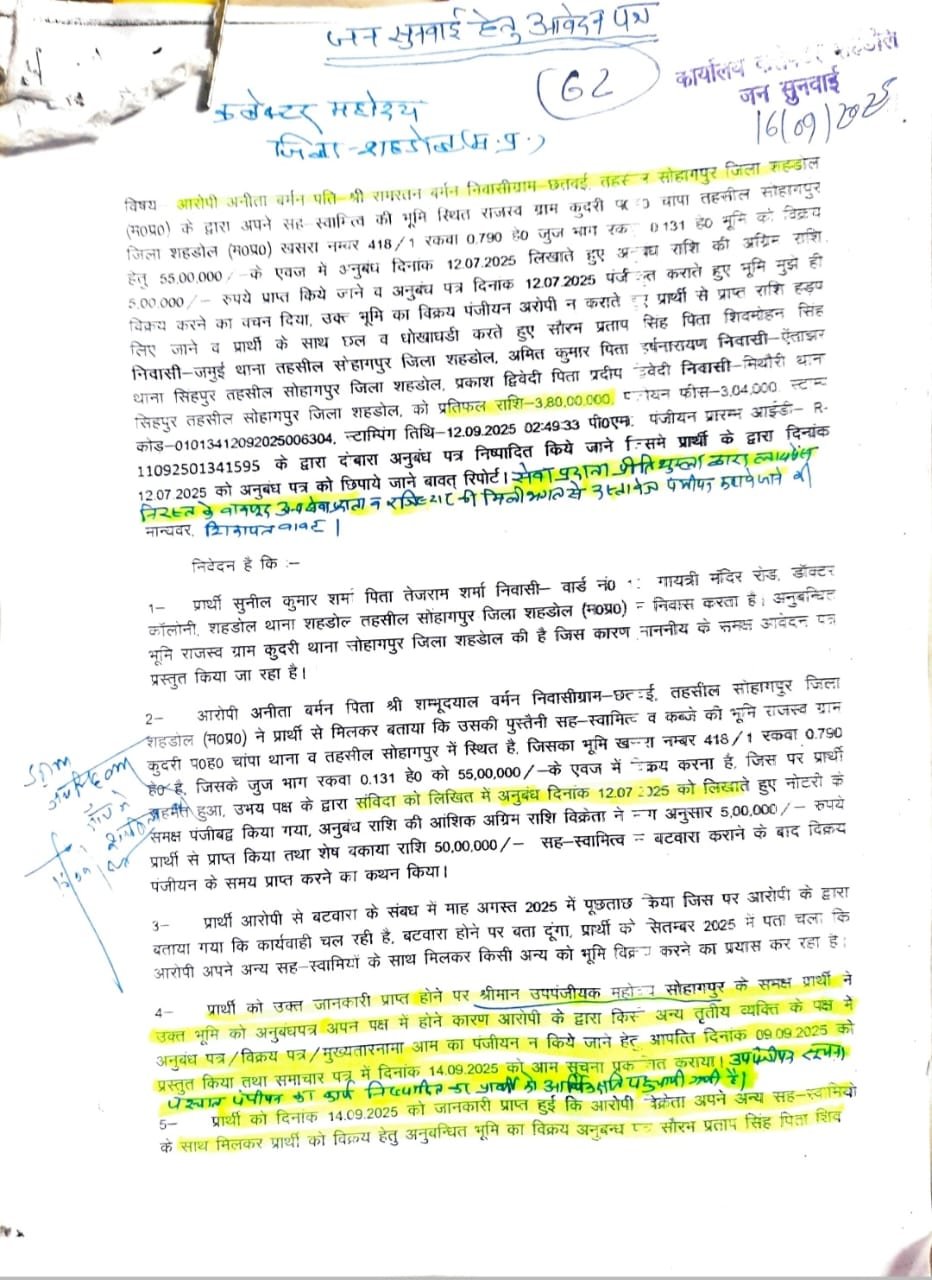 पीड़ित सुनील कुमार शर्मा ने कलेक्टर जनसुनवाई में शिकायत दर्ज कराते हुए आरोप लगाया है कि आरोपी महिला अनीता वर्मन पति रामरतन वर्मन ने 12 जुलाई 2025 को उक्त भूमि को 55 लाख रुपये में बेचने का अनुबंध उससे किया था। इस दौरान 5 लाख रुपये अग्रिम भी लिए गए और बाकायदा नोटरी के सामने अनुबंध लिखा गया। तय हुआ था कि बंटवारा पूरा होने पर शेष राशि लेकर पंजीयन कराया जाएगा।