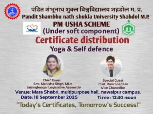 शहडोल। पंडित शंभूनाथ शुक्ल विश्वविद्यालय शहडोल में आज 18 सितंबर को प्रधानमंत्री उषा योजना (सॉफ्ट कॉम्पोनेंट) के अंतर्गत योग एवं...
