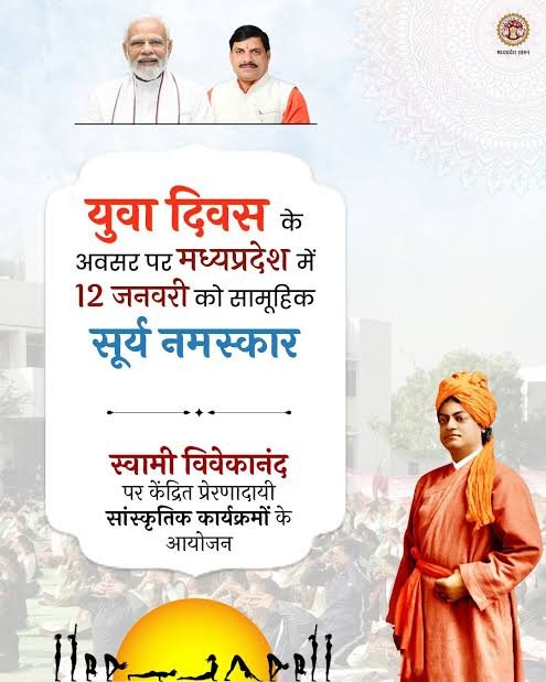 कटनी।। स्वामी विवेकानंद के जन्म दिवस 12 जनवरी को प्रतिवर्ष युवा दिवस के रूप में मनाया जाता है। युवा दिवस के मौके पर विद्यालयों, महाविद्यालयों और शिक्षण संस्थाओं में सामूहिक सूर्य नमस्कार का आयोजन किया जाता है। सामूहिक सूर्य नमस्कार के साथ स्वामी विवेकानंद पर केन्द्रित प्रेरणादायी शैक्षिक और सांस्कृतिक कार्यक्रम भी आयोजित किये जाते हैं। स्कूल शिक्षा विभाग ने सामूहिक सूर्य नमस्कार और इससे जुड़े कार्यक्रमों में स्वयंसेवी संगठनों और आम लोगों की भागीदारी भी सुनिश्चित करने के लिये कहा है। विभाग द्वारा जारी निर्देशों में कहा गया है कि सभी विद्यालयीन संस्थाओं में 12 जनवरी को प्रातः 9 बजे से प्रातः 10ः30 बजे तक सामूहिक सूर्य नमस्कार का आयोजन हो। कार्यक्रम में राष्ट्रीय गीत वंदेमातरम और मध्यप्रदेश गान का सामूहिक गायन होगा। इसी दौरान मुख्यमंत्री डॉ. मोहन यादव का रेडियो पर संदेश प्रसारित होगा। सामूहिक सूर्य नमस्कार सभी शिक्षण संस्थाओं में एक साथ, एक संकेत पर किया जायेगा। सामूहिक सूर्य नमस्कार में शामिल विद्यार्थियों को योग और स्वास्थ्य के प्रति सजग रहने के महत्व के बारे में भी बताया जायेगा।