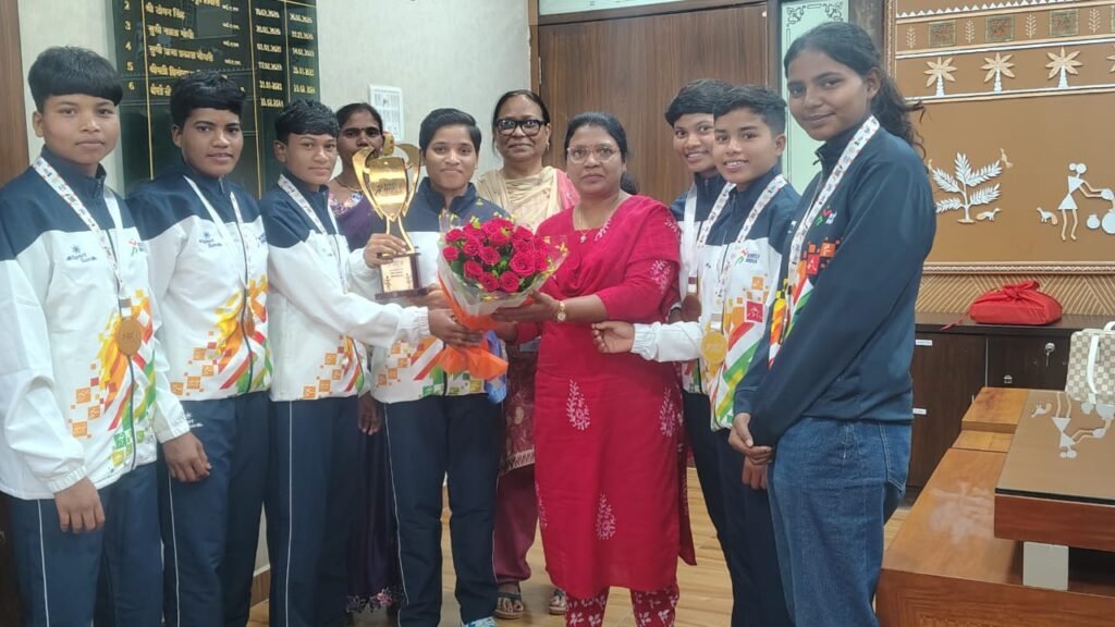 गौरेला पेंड्रा मरवाही, 11 अप्रैल 2026/ खेलो इंडिया ट्राईबल गेम में गोल्ड मेडल जीतकर वापस आने पर खिलाड़ियों को कलेक्टर श्रीमती लीना कमलेश मंडावी ने अपने कार्यालय में पुष्प गुच्छ देकर उनका स्वागत किया और अगले प्रतियोगिता में बहते प्रदर्शन के लिए शुभकामनाएं दी। उल्लेखनीय है कि छत्तीसगढ़ राज्य की मेजबानी में प्रथम बार आयोजित राजधानी रायपुर में 25 मार्च से 3 अप्रैल तक सरदार बलवीर सिंह जूनेजा स्टेडियम में महिला कबड्डी प्रतियोगिता में प्रथम बार में ही स्वर्ण पदक हासिल करने के उपरांत गौरेला पेण्ड्रा मरवाही जिले में वापसी पर कलेक्टर ने शुक्रवार को सभी खिलाड़ियों का स्वागत किया और शुभकामनाएं दी। खेलों इंडिया ट्राईबल गेम में शानदार प्रदर्शन करने वाली कबड्डी प्रशिक्षण केन्द्र पेण्ड्रा की 6 खिलाड़ी धनेश्वरी सलाम, प्रीति सलाम, आशा सिंदराम, कैलशिया सिंदराम, कुमारी तारा और लवली टेकाम के साथ ही तैराकी 100 मीटर बटरफ्लाई इवेंट में कांस्य पदक प्राप्त करने पर न्यासा पैकरा शामिल हैं। जिला खेल अधिकारी श्रीमती सीमा डेविड ने कलेक्टर से सभी खिलाड़ियों का परिचय कराया।