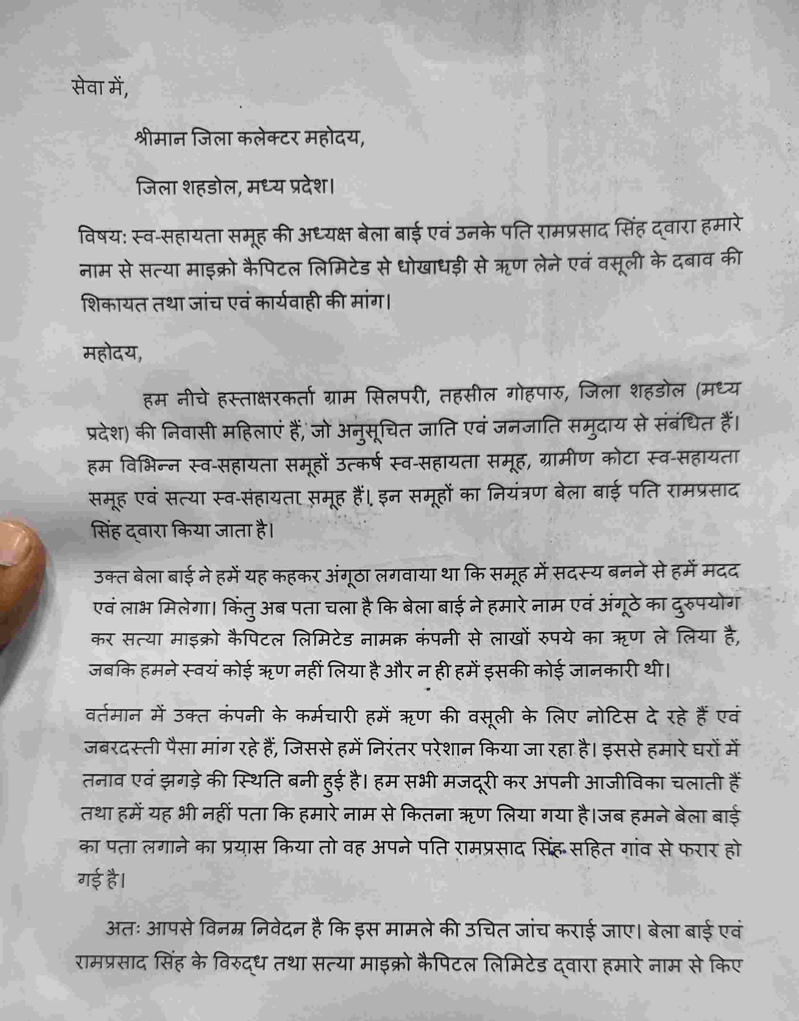 महिलाओं ने अपने आवेदन में बताया कि वे विभिन्न स्व-सहायता समूहों से जुड़ी हैं, जिनका संचालन बेला बाई एवं उनके पति रामप्रसाद सिंह द्वारा किया जाता था। आरोप है कि समूह से जोड़ने के नाम पर महिलाओं से अंगूठा लगवाया गया और बाद में उनके नाम व पहचान का दुरुपयोग कर “सत्या माइक्रो कैपिटल लिमिटेड” नामक कंपनी से लाखों रुपये का ऋण ले लिया गया। महिलाओं का कहना है कि उन्होंने स्वयं कोई ऋण नहीं लिया, न ही उन्हें इसकी जानकारी दी गई।