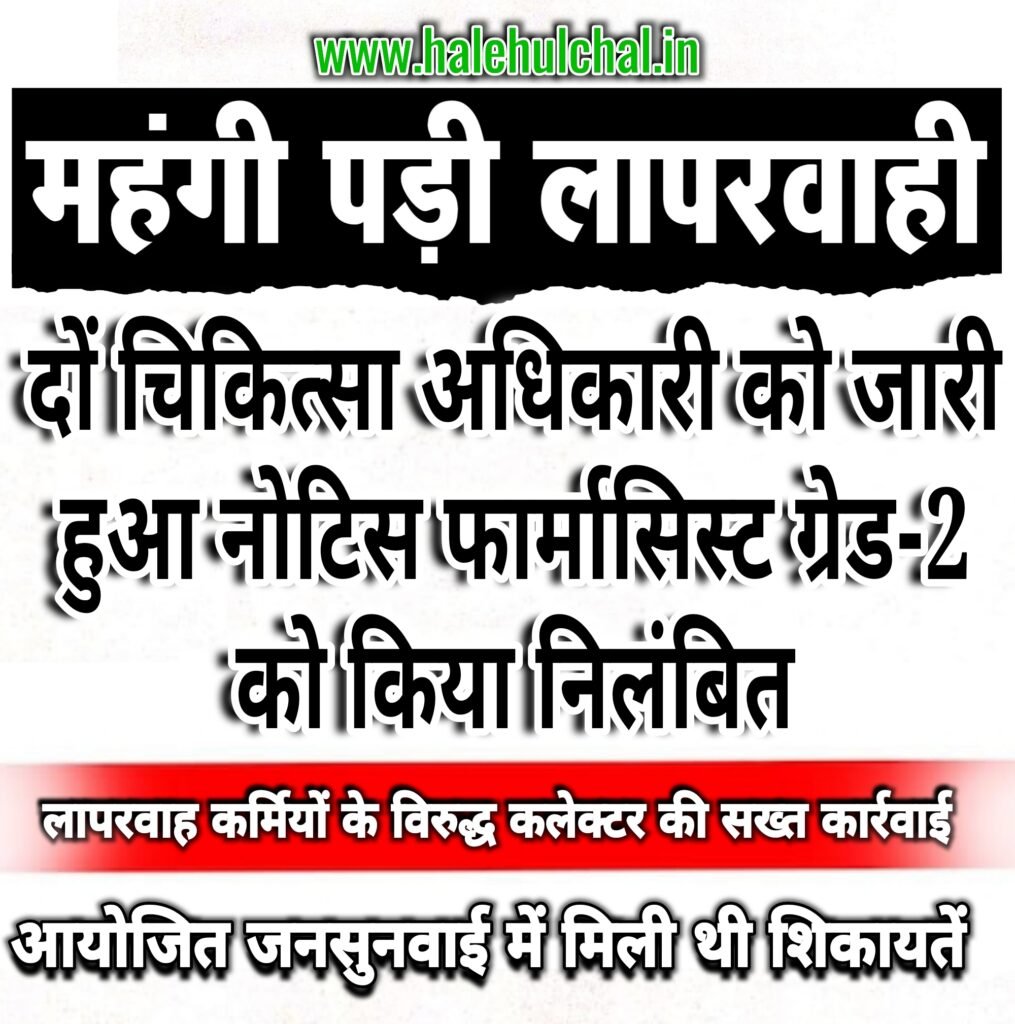 आयोजित जनसुनवाई में मिली थी शिकायतें पदीय कर्तव्यों के प्रति लापरवाही बरतना तीन स्वास्थ्य कर्मियों को पड़ा महंगा,दों चिकित्सा अधिकारी को जारी हुआ नोटिस फार्मासिस्ट ग्रेड-2 को किया निलंबित