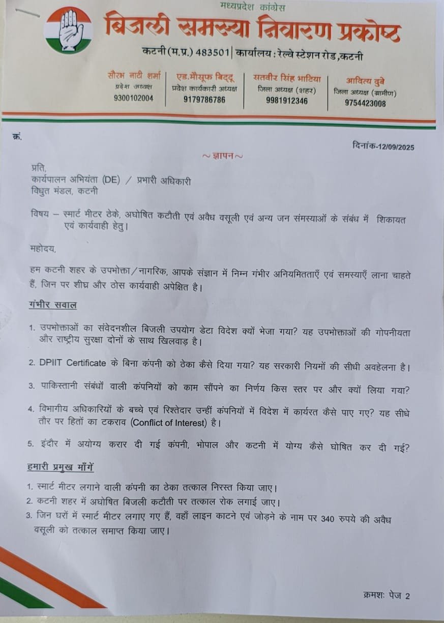 कटनी।। शहर में बिजली विभाग की कथित मनमानी, स्मार्ट मीटर घोटाले और अघोषित बिजली कटौती को लेकर उपभोक्ताओं का आक्रोश लगातार बढ़ता जा रहा है। शुक्रवार को मध्यप्रदेश कांग्रेस बिजली समस्या निवारण प्रकोष्ठ ने कार्यपालन अभियंता (DE) विद्युत मंडल को ज्ञापन सौंपते हुए विभाग की गंभीर अनियमितताओं पर तुरंत कार्रवाई की मांग की। उपभोक्ताओं के सवाल के साथ सुरक्षा और पारदर्शिता पर उठे गंभीर प्रश्न ज्ञापन में उपभोक्ताओं और कांग्रेस पदाधिकारियों ने कई गंभीर सवाल उठाए। प्रमुख रूप से यह पूछा गया कि उपभोक्ताओं का संवेदनशील बिजली उपयोग डेटा विदेश क्यों भेजा गया, क्या यह राष्ट्रीय सुरक्षा के साथ खिलवाड़ नहीं है? बिना DPIIT सर्टिफिकेट के संबंधित कंपनी को ठेका कैसे दिया गया?पाकिस्तानी संबंधों वाली कंपनियों को काम क्यों सौंपा गया और यह निर्णय किस स्तर पर लिया गया? विभागीय अधिकारियों के परिजन उन्हीं कंपनियों में विदेश में कार्यरत कैसे पाए गए? इंदौर में अयोग्य घोषित कंपनी भोपाल और कटनी में योग्य कैसे करार दी गई? ज्ञापन में उपभोक्ताओं ने साफ कहा कि वे अब विभाग की तानाशाही और अवैध वसूली को बर्दाश्त नहीं करेंगे। कांग्रेस ने प्रमुख मांगें इस प्रकार रखीं कि स्मार्ट मीटर लगाने वाली कंपनी का ठेका तत्काल निरस्त किया जाए। कटनी शहर में अघोषित बिजली कटौती पर रोक लगे। स्मार्ट मीटर उपभोक्ताओं से लाइन जोड़ने–काटने पर वसूले जा रहे 340 रुपये की वसूली बंद हो। बिना पूर्व सूचना दिए कनेक्शन काटने की प्रथा समाप्त हो। उपभोक्ताओं को पुराने मीटर लगवाने का विकल्प दिया जाए। एवरेज बिलिंग के नाम पर 300 यूनिट का जबरन बिल बंद हो। स्मार्ट मीटर नहीं लगवाने वालों पर दबाव डालना बंद किया जाए। मीटर लगाने के दौरान महिलाओं और बच्चों से की गई बदसलूकी पर सख्त कार्रवाई की जाए। शहर में सड़कों पर झूल रही तारों और पुराने जर्जर नेटवर्क को तत्काल सुधारा जाए। एक से अधिक मीटर लगाने की प्रक्रिया फिर से शुरू की जाए। आवेदन पर पावती देने की बाध्यता तय की जाए। बिजली सुधार के लिए अतिरिक्त स्टाफ की नियुक्ति की जाए।