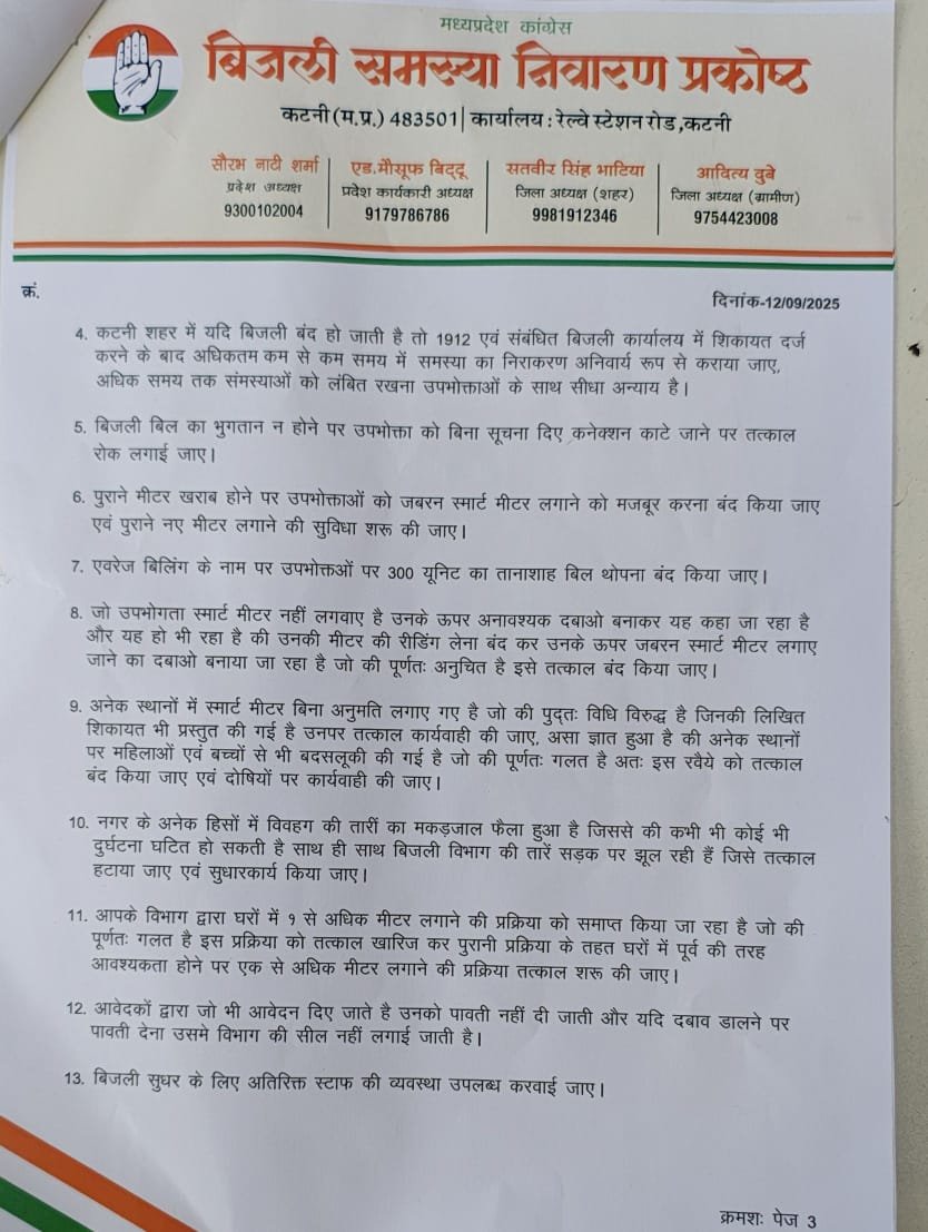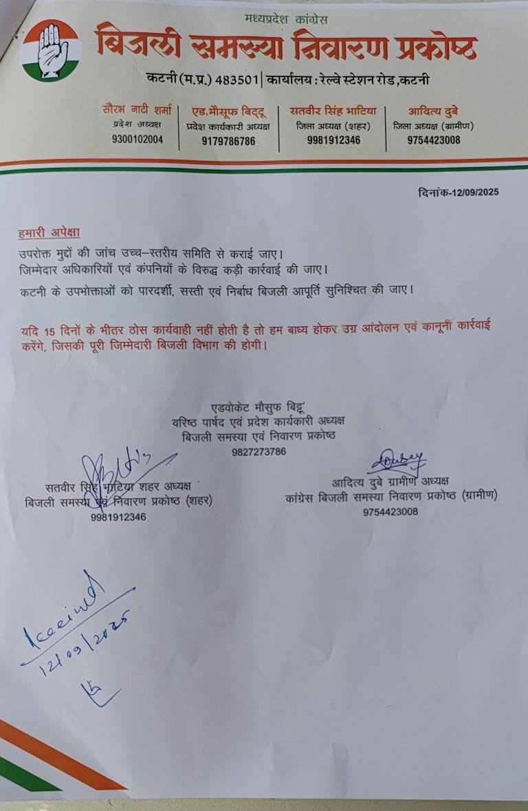 प्रदेश कार्यकारी अध्यक्ष एडवोकेट मौसुफ बिट्टू, शहर अध्यक्ष सतवीर सिंह भाटिया और ग्रामीण अध्यक्ष आदित्य दुबे ने चेतावनी दी कि यदि 15 दिनों के भीतर ठोस कार्रवाई नहीं होती है तो कांग्रेस उपभोक्ताओं के साथ मिलकर उग्र आंदोलन और कानूनी लड़ाई शुरू करेगी। इसकी पूरी जिम्मेदारी बिजली विभाग की होगी।