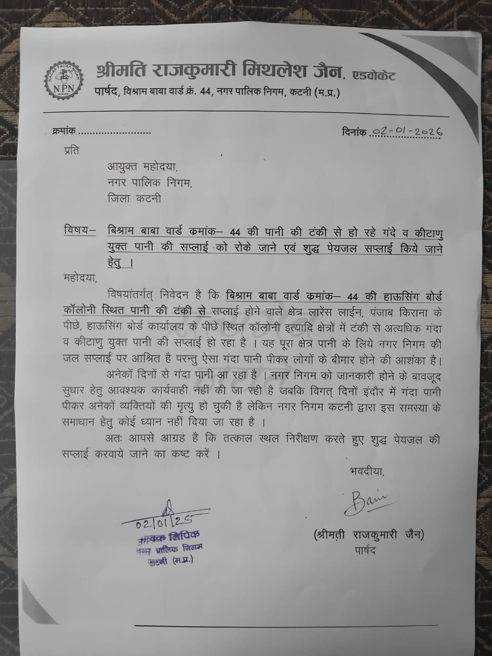कटनी।। नगर निगम कटनी की उदासीन कार्यप्रणाली एक बार फिर सवालों के घेरे में है। बिश्राम बाबा वार्ड क्रमांक-44 की पार्षद श्रीमती राजकुमारी मिथलेश जैन ने नगर निगम के अधिकारियों को शिकायत देकर वार्ड की हाऊसिंग बोर्ड कॉलोनी स्थित पानी की टंकी से आपूर्ति हो रहे अत्यधिक गंदे एवं कीटाणु युक्त पानी की गंभीर समस्या से अवगत कराया है। पार्षद द्वारा दी गई जानकारी के अनुसार लारेंस लाईन, पंजाब किराना के पीछे, हाऊसिंग बोर्ड कार्यालय के पीछे की कॉलोनियाँ सहित पूरा क्षेत्र पूरी तरह नगर निगम की जलापूर्ति पर निर्भर है। बावजूद इसके, बीते कई दिनों से इन इलाकों में ऐसा दूषित पानी सप्लाई किया जा रहा है, जिसे पीकर संक्रामक बीमारियाँ फैलने का गंभीर खतरा बना हुआ है। सबसे चिंताजनक तथ्य यह है कि नगर निगम को इस समस्या की जानकारी होने के बावजूद अब तक कोई ठोस सुधारात्मक कार्यवाही नहीं की गई। जबकि हाल ही में इंदौर में दूषित पेयजल के कारण अनेक लोगों की मृत्यु जैसी दर्दनाक घटनाएँ सामने आ चुकी हैं। इसके बावजूद नगर निगम द्वारा चेतना और सतर्कता का अभाव साफ दिखाई दे रहा है। पार्षद श्रीमती जैन ने आयुक्त एवं संबंधित अधिकारियों से तत्काल स्थल निरीक्षण, टंकी की सफाई, पाइपलाइन जांच, जल सैंपलिंग एवं शुद्ध पेयजल की निर्बाध आपूर्ति सुनिश्चित करने की मांग की है।