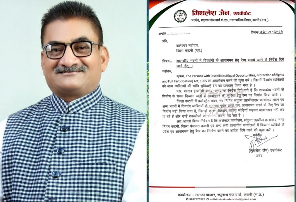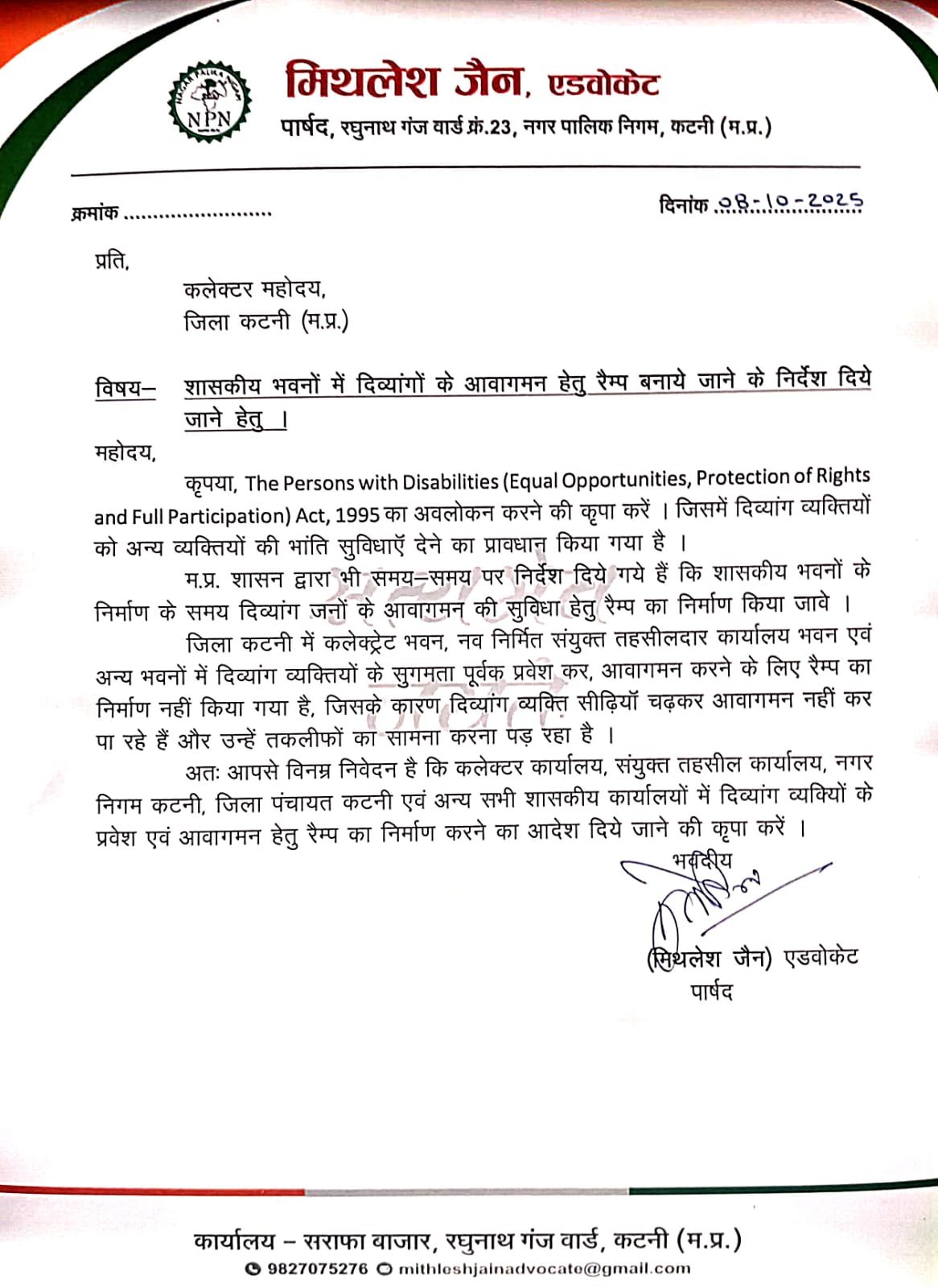 पार्षद जैन ने पत्र के माध्यम से यह भी निवेदन किया है कि कलेक्टर कटनी को निर्देश जारी किए जाएं ताकि जिले के प्रमुख कार्यालयों-कलेक्ट्रेट, जिला पंचायत, संयुक्त तहसील कार्यालय एवं नगर निगम भवन में रैम्प का निर्माण शीघ्र कराया जा सके, जिससे दिव्यांगजनों को आने-जाने में कोई असुविधा न हो। उन्होंने कहा कि “The Persons with Disabilities (Equal Opportunities, Protection of Rights and Full Participation) Act, 1995” के अंतर्गत दिव्यांग व्यक्तियों को समान सुविधाएँ प्रदान करने का प्रावधान किया गया है। इसके बावजूद कलेक्ट्रेट और अन्य सरकारी भवनों में रैम्प का अभाव होने से दिव्यांग नागरिकों को सीढ़ियाँ चढ़ने में भारी परेशानी का सामना करना पड़ता है। जैन ने कहा कि शासन द्वारा समय-समय पर यह निर्देश जारी किए जाते रहे हैं कि शासकीय भवनों के निर्माण में दिव्यांग जनों के सुगम आवागमन के लिए रैम्प अनिवार्य रूप से बनाए जाएँ, किंतु कटनी जिले में इन निर्देशों का पालन नहीं हो रहा है। पार्षद मिथलेश जैन ने उम्मीद जताई है कि शासन व प्रशासन इस गंभीर विषय पर शीघ्र संज्ञान लेकर दिव्यांगजनोें के सम्मानजनक आवागमन की सुविधा हेतु ठोस कदम उठाएगा।