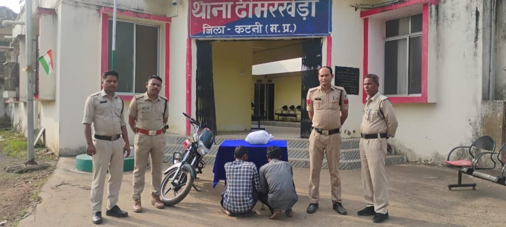 कटनी।। थाना प्रभारी ढीमरखेडा अभिषेक चौबे के नेतृत्व में अवैध मादक पदार्थ गांजा के व्यापार में लगे दो व्यक्तियों के कब्जे से 02 किलो अवैध मादक पदार्थ गांजा एंव एक मोटर सायकिल को जप्त किया गया है। ग्राम कटरा बेलकुंड नदी घाट के ऊपर रोड के पास दो व्यक्तियों को संदेह होने से पकड कर नाम पता पूछा गया जो अपना नाम ध्रुप सिंह पिता देव सिंह गोंड उम्र 35 साल, मुकेश पिता वीरेन्द्र सिंह गोंड उम्र 30 साल दोनो निवासी ग्राम कटरा के रहने वाला बताये उनके अधिपत्य से 02 किलो अवैध मादक पदार्थ गांजा बरामद हुआ पुलिस नें आरोपियों के साथ घटना में प्रयुक्त बजाज कंपनी की मोटरसाइकिल क्रमांक एमपी 20 एमएस 8133 को जप्त कर अपराध क 419/25 धारा 8/20 एनडीपीएस एक्ट का कायम कर विवेचना मे लिया गया है।