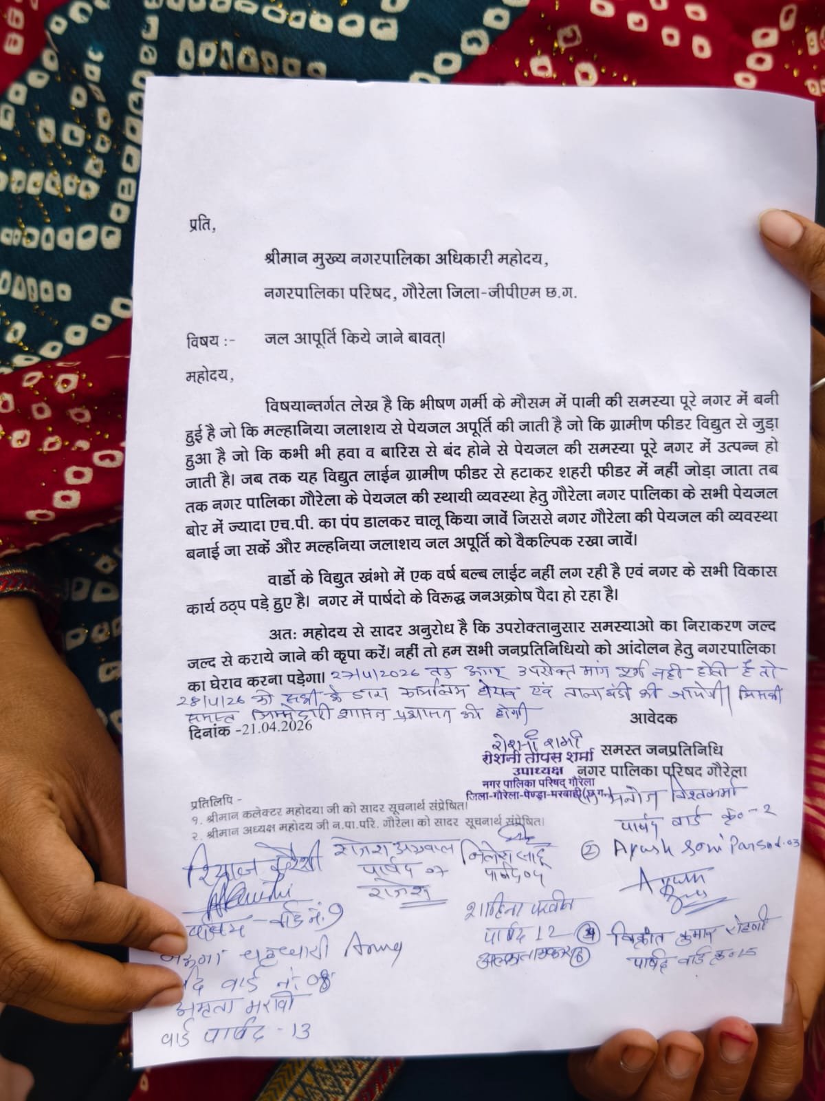 गौरेला (जीपीएम): भीषण गर्मी के मौसम में गौरेला नगर पालिका क्षेत्र में पेयजल की भारी किल्लत हो गई है। पानी की समस्या, वार्डों में लाइट न होने और रुके हुए विकास कार्यों से नाराज होकर सभी पार्षदों ने एकजुट होकर मुख्य नगर पालिका अधिकारी (CMO) को ज्ञापन सौंपा है। पार्षदों ने प्रशासन पर लापरवाही का आरोप लगाते हुए चेतावनी दी है कि यदि जल्द समस्या का समाधान नहीं हुआ, तो वे नगर पालिका कार्यालय में तालाबंदी करेंगे।