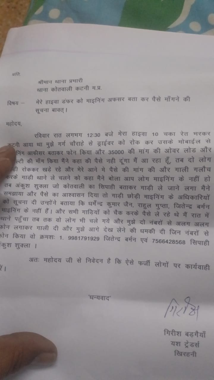 प्राप्त जानकारी के अनुसार, रेत कारोबारी गिरीश बड़गैंया का 10 चक्का हाइवा वाहन एमपी 16 एएच 1230 रविवार रात करीब 12:30 बजे रेत लेकर कटनी पहुंचा। जैसे ही वाहन गर्ग चौराहे के पास पहुंचा, वहां पहले से मौजूद 3-4 युवकों ने ट्रक को रोक लिया। आरोप है कि इन युवकों ने खुद को माइनिंग अधिकारी बताते हुए ओवरलोडिंग और दस्तावेज जांच के नाम पर चालक से पूछताछ शुरू कर दी। कारोबारी के अनुसार, आरोपियों ने चालक को कार्रवाई का डर दिखाते हुए 35 हजार रुपए की मांग की। जब चालक ने पैसे देने से इनकार किया तो उसे धमकाया गया और वाहन जब्त कर थाने ले जाने की बात कही गई। सूचना मिलने पर मौके पर पहुंचे कारोबारी के साथ भी आरोपियों ने अभद्रता की और गाली-गलौज करते हुए दबाव बनाने का प्रयास किया। चौंकाने वाली बात यह रही कि एक युवक ने खुद को अंकुश शुक्ला बताते हुए कोतवाली थाना का सिपाही होने का दावा किया और वाहन को जबरन ले जाने की कोशिश की। बाद में दबाव और आश्वासन के बीच वाहन को छोड़ दिया गया।