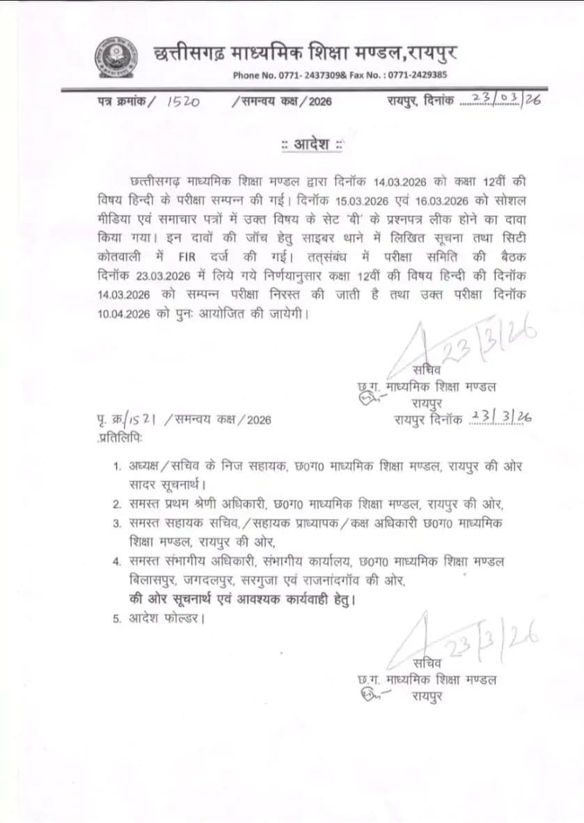 रायपुर। छत्तीसगढ़ में 12वीं बोर्ड परीक्षाओं में पेपर लीक की अफवाहों के बाद माध्यमिक शिक्षा मंडल ने बड़ा फैसला लिया है। माध्यमिक शिक्षा मंडल ने आदेश जारी कर 12वीं बोर्ड की हिंदी की परीक्षा को रद्द कर दिया है। मंडल ने 14 मार्च 2026 को आयोजित हिंदी परीक्षा को निरस्त कर दिया है। जारी आदेश के अनुसार, अब कक्षा 12वीं की हिंदी विषय की परीक्षा 10 अप्रैल को आयोजित की जाएगी। इसको लेकर आधिकारिक निर्देश जारी कर दिए गए हैं।