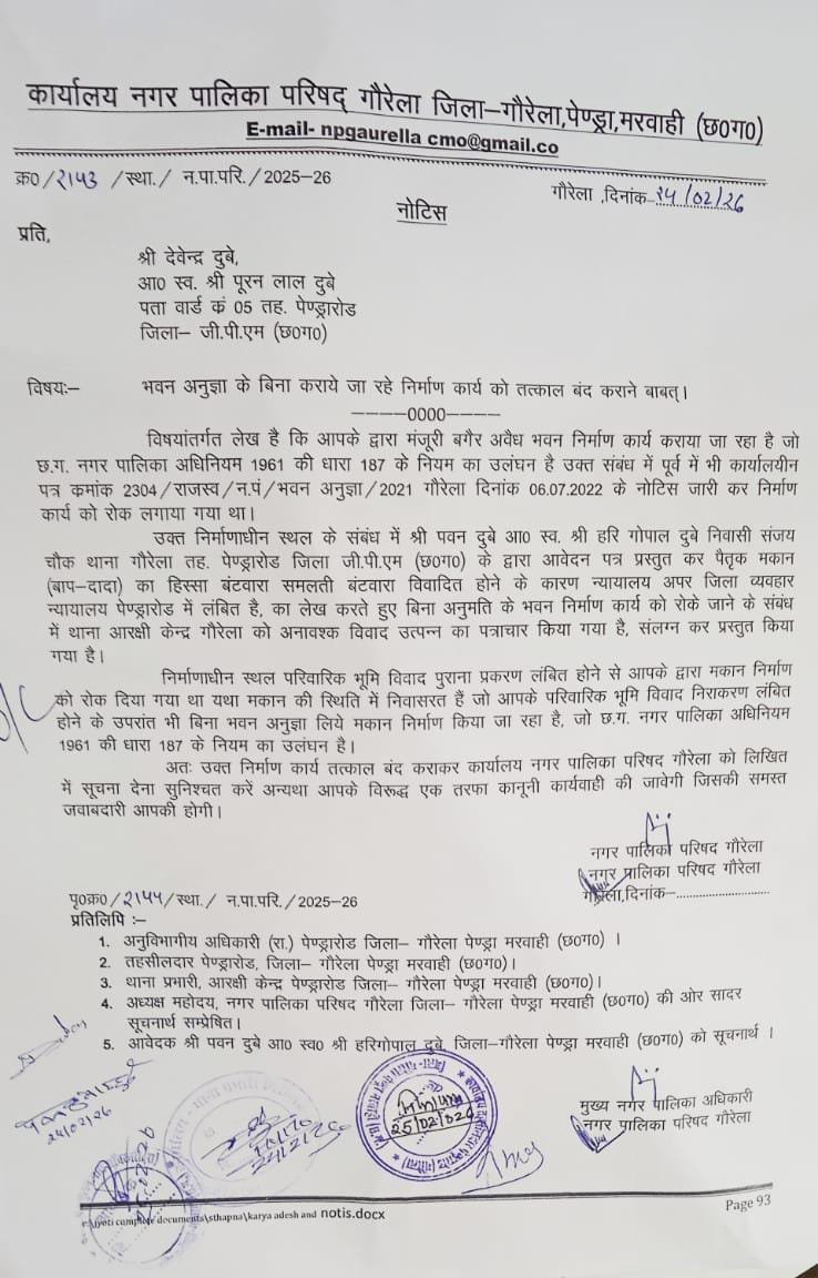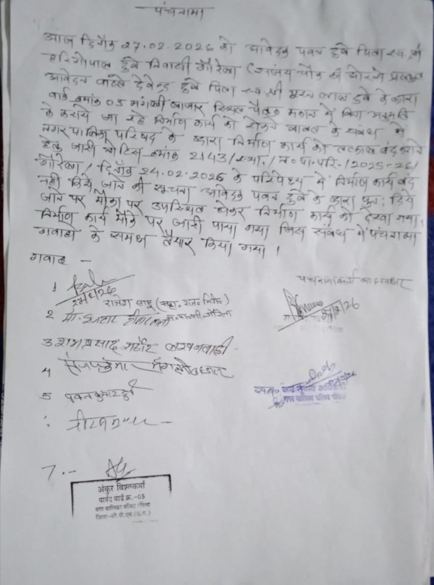 फरवरी-मार्च 2026: नगर पालिका ने फिर लगातार नोटिस जारी किए। 27 फरवरी को पार्षद की मौजूदगी में ‘काम चालू होने का पंचनामा’ बना। 20 मार्च को अंतिम चेतावनी दी गई।