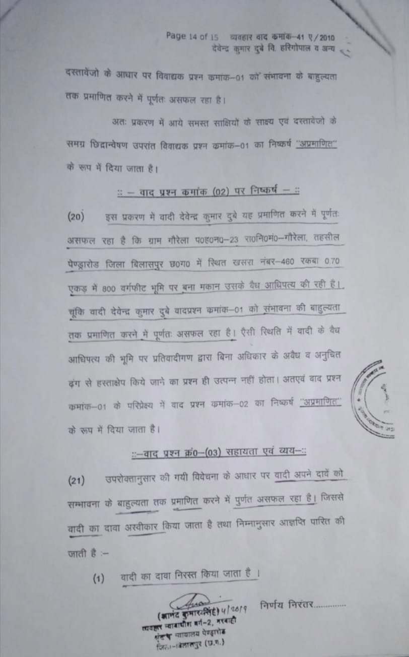 “वादी देवेन्द्र कुमार दुबे यह प्रमाणित करने में पूर्णतः असफल रहा है कि ग्राम गौरेला… में स्थित खसरा नंबर-460 रकबा 0.70 एकड़ में 800 वर्गफीट भूमि पर बना मकान उसके वैध आधिपत्य में रहा है।”