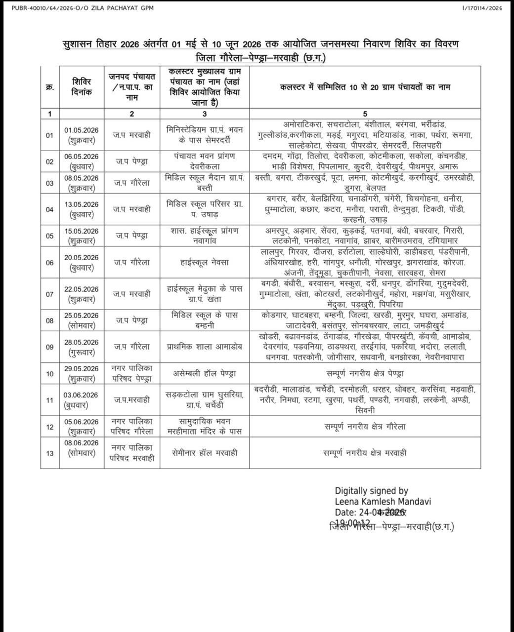 कार्यक्रम की शुरुआत 01 मई 2026 को जनपद पंचायत मरवाही के अंतर्गत सेमरदर्री क्षेत्र से होगी। इसके बाद 6 मई को पेंड्रा, 8 मई को गौरेला, 13 मई को मरवाही तथा 15 मई को पेंड्रा में शिविर आयोजित किए जाएंगे। इसी क्रम में 20 मई, 22 मई, 25 मई, 28 मई एवं 29 मई को विभिन्न स्थानों पर शिविर लगेंगे।