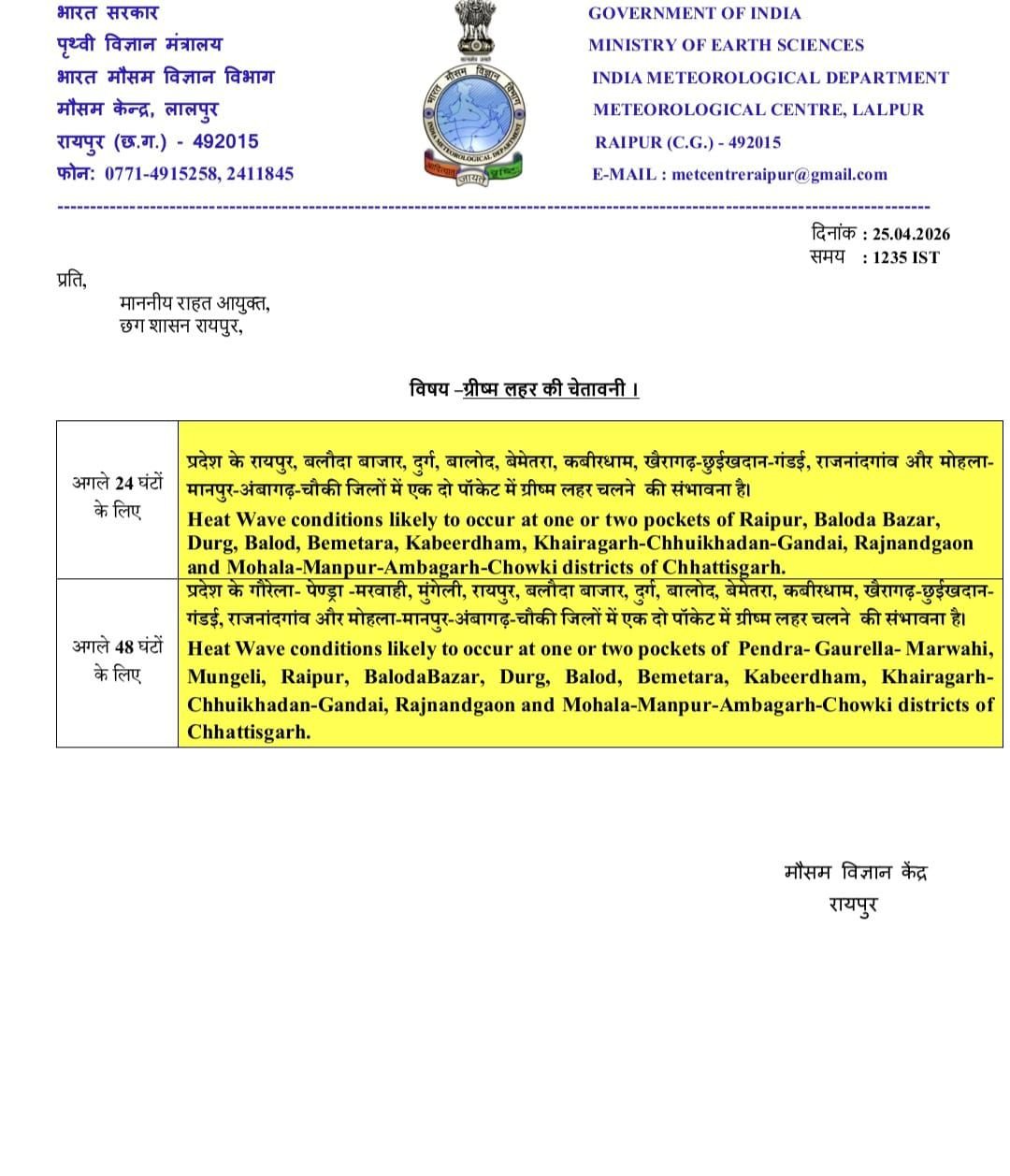 प्रदेश के इन जिलों के एक-दो स्थानों (पॉकेट) पर ग्रीष्म लहर (लू) चलने की प्रबल संभावना है: रायपुर, बलौदाबाजार, दुर्ग, बालोद, बेमेतरा, कबीरधाम, खैरागढ़-छुईखदान-गंडई, राजनांदगांव, मोहला-मानपुर-अंबागढ़-चौकी