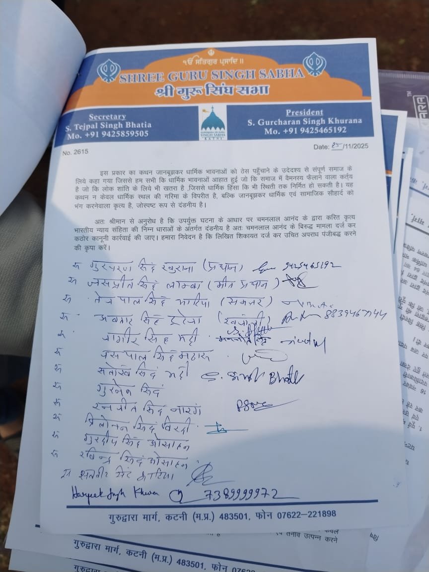 ने हस्ताक्षरित शिकायत में मांग की है कि चमनलाल आनंद के खिलाफ भारतीय न्याय संहिता की संबंधित धाराओं में प्रकरण दर्ज कर कठोर दंडात्मक कार्रवाई की जाए।