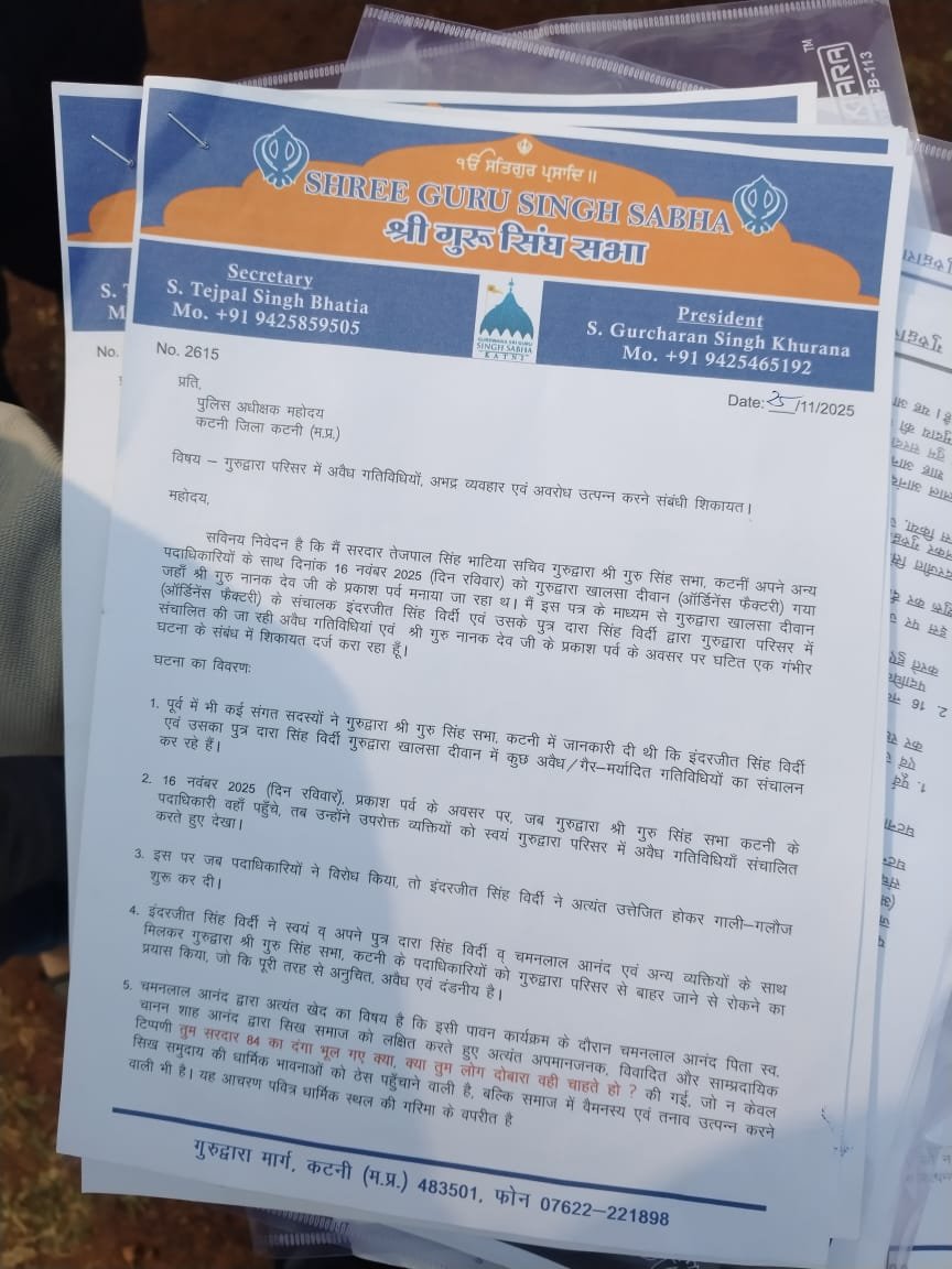 कटनी।। गुरु नानक देव जी के पावन प्रकाश पर्व के अवसर पर गुरुद्वारा खालसा दीवान ऑर्डिनेंस फैक्टरी परिसर में एक विवादास्पद घटना सामने आई है। गुरुद्वारा श्री गुरु सिंह सभा, कटनी के पदाधिकारियों ने पुलिस अधीक्षक कटनी को ज्ञापन सौंपकर गुरुद्वारा खालसा दीवान के संचालक इंदरजीत सिंह विर्दी, उसके पुत्र दारा सिंह विर्दी तथा चमनलाल आनंद सहित अन्य व्यक्तियों पर अवैध गतिविधियाँ संचालित करने, अभद्र व्यवहार करने एवं साम्प्रदायिक माहौल बिगाड़ने के गंभीर आरोप लगाए हैं। गुरु सिंह सभा के पदाधिकारियों का कहना है कि समाज के कई सदस्यों ने पहले भी जानकारी दी थी कि गुरुद्वारा खालसा दीवान परिसर में इंदरजीत सिंह विर्दी एवं उसका पुत्र कुछ अवैध और धार्मिक मर्यादा के विपरीत गतिविधियाँ कर रहे हैं। इस पर स्पष्टता के लिए सभा के पदाधिकारी 16 नवंबर 2025, रविवार को स्वयं मौके पर पहुँचे।