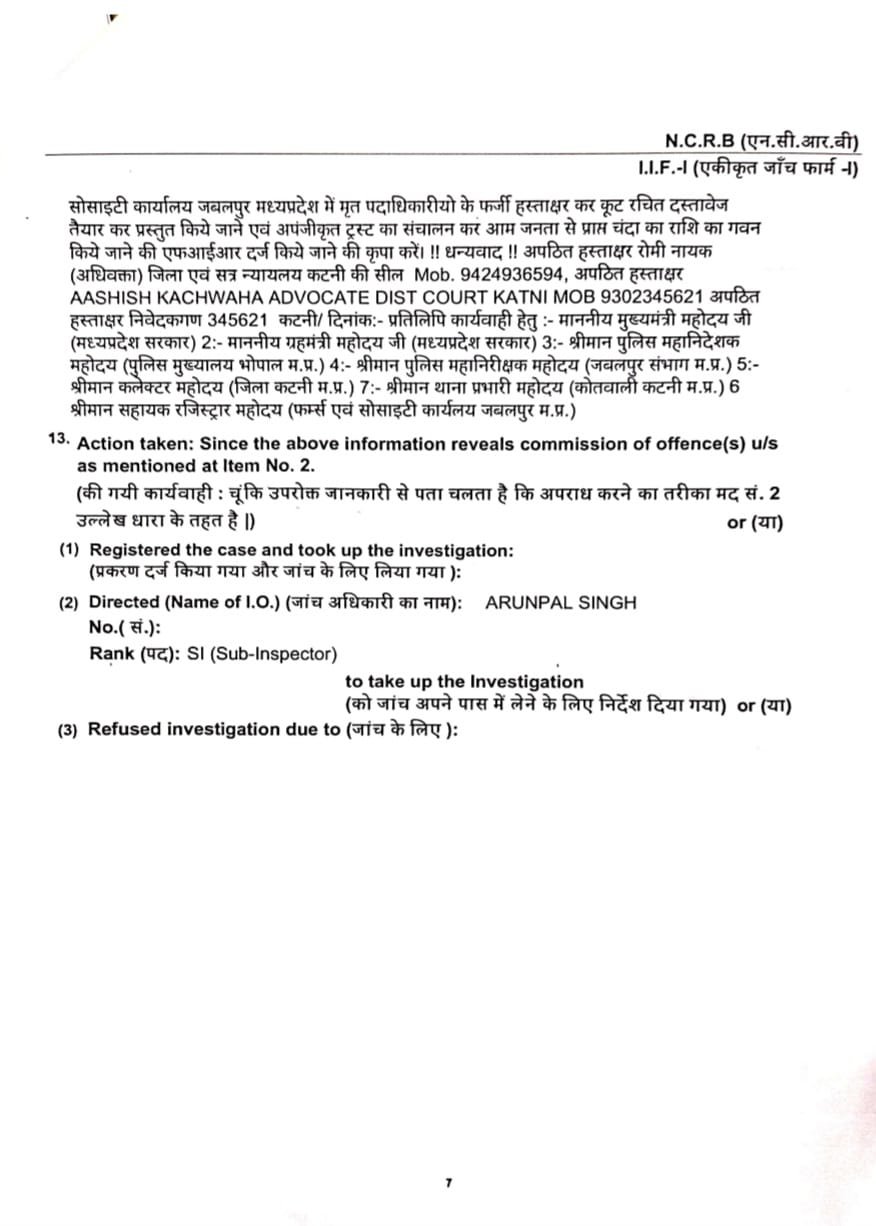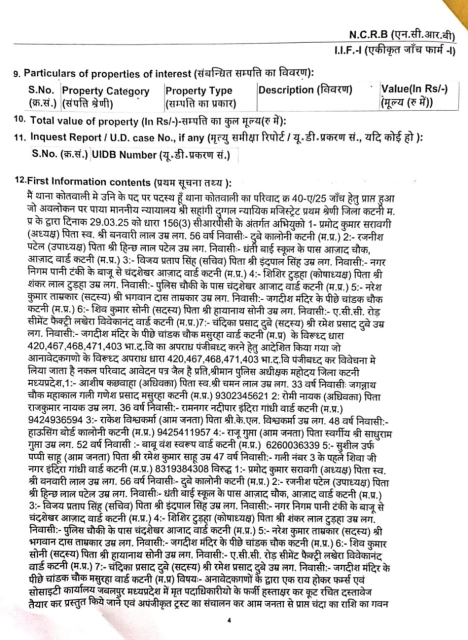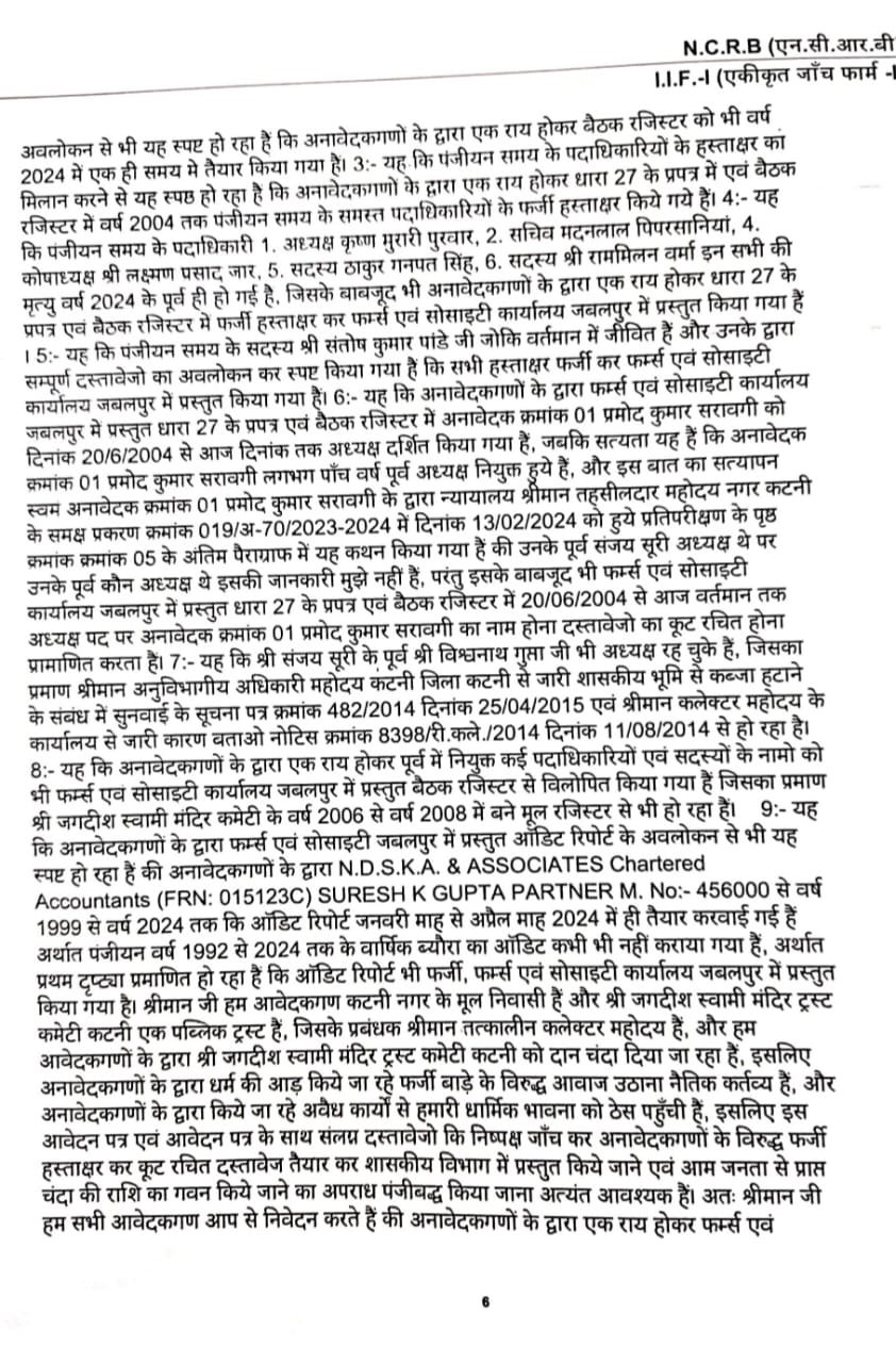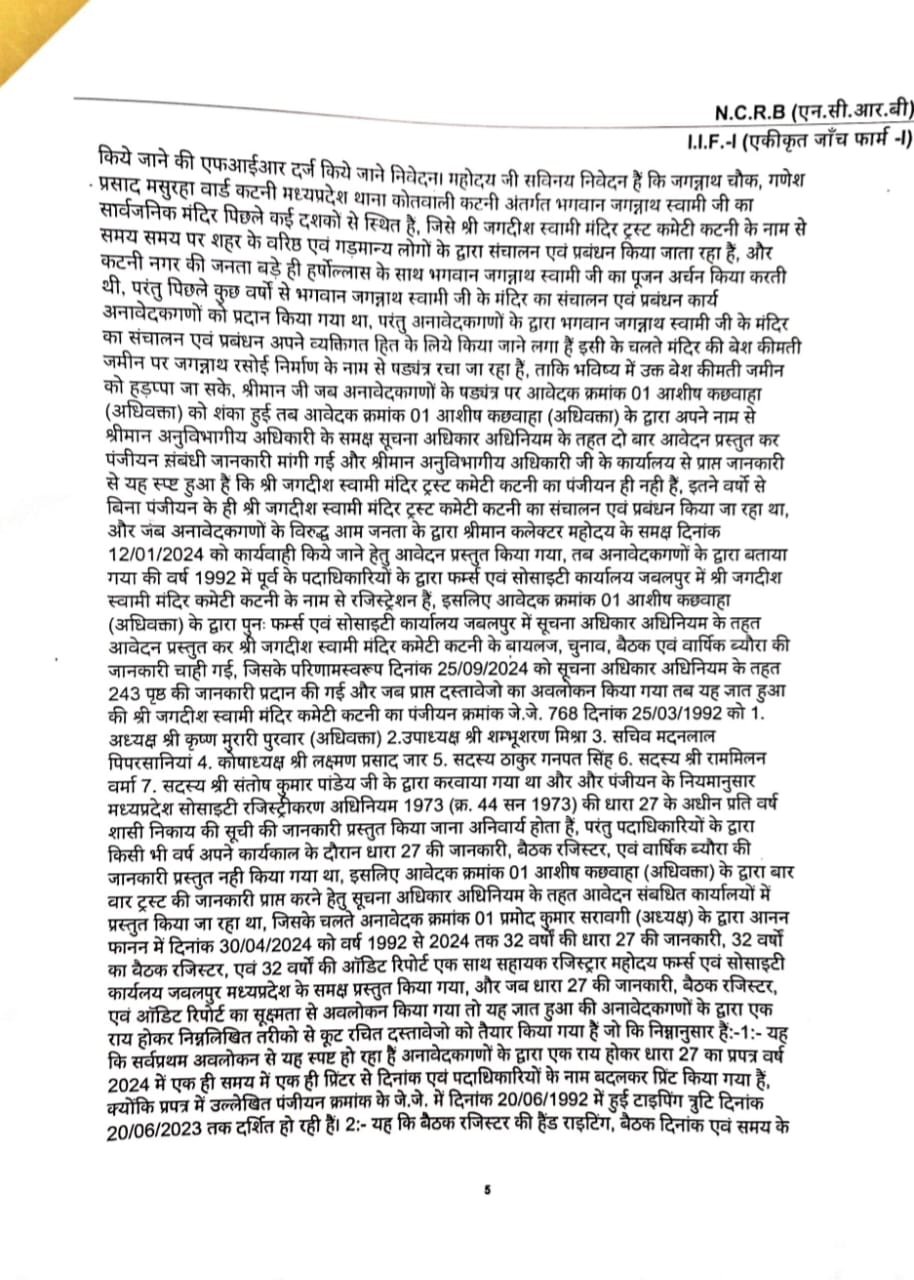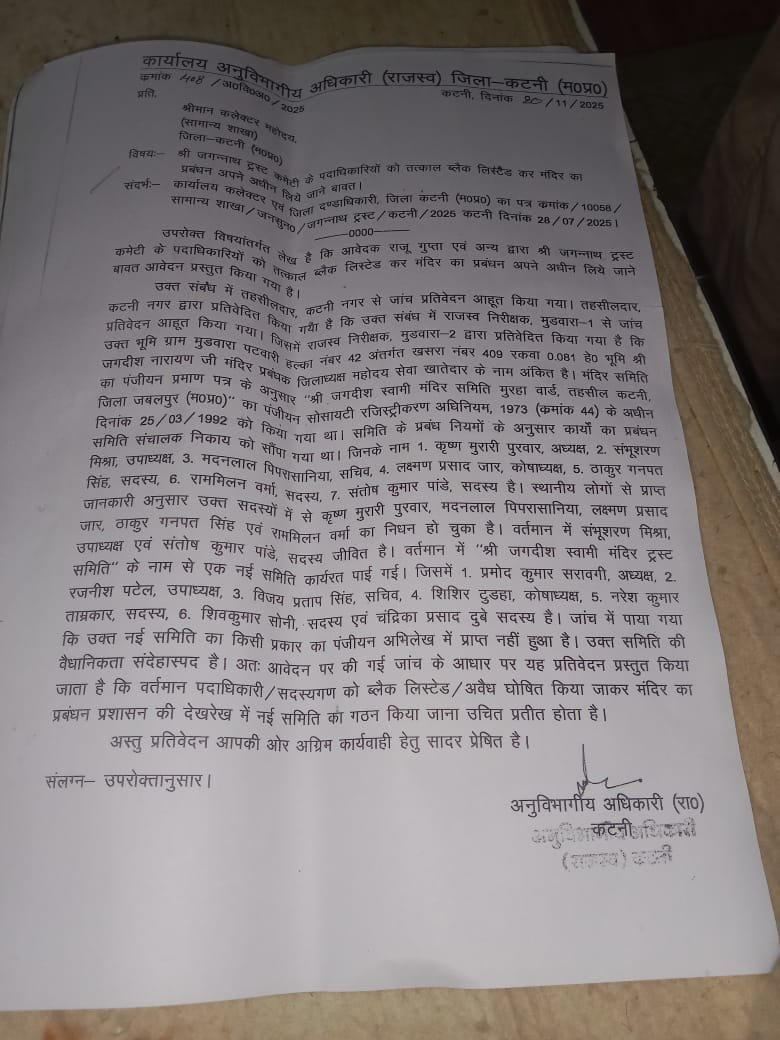 रिपोर्ट के अनुसार, यह नई समिति मध्यप्रदेश सार्वजनिक न्यास अधिनियम, 1951 के अंतर्गत कानूनी रूप से अस्तित्व में ही नहीं आती। इसके बावजूद उसी के आवेदन पर एक गरीब परिवार के खिलाफ कठोर राजस्व कार्रवाई की कोशिश की गई। इतना ही नहीं, जिन लोगों ने खुद को ट्रस्ट का पदाधिकारी बताकर यह कार्रवाई करवाई, उन्हीं के खिलाफ कोतवाली थाना कटनी में धोखाधड़ी और जालसाजी से जुड़ी गंभीर धाराओं—420, 467, 468, 471 और 403—के तहत एफआईआर दर्ज है। जांच रिपोर्ट में इन पदाधिकारियों को ब्लैकलिस्ट किए जाने योग्य भी बताया गया है और मंदिर व भूमि प्रबंधन को प्रशासन के अधीन लेने की सिफारिश की गई है।