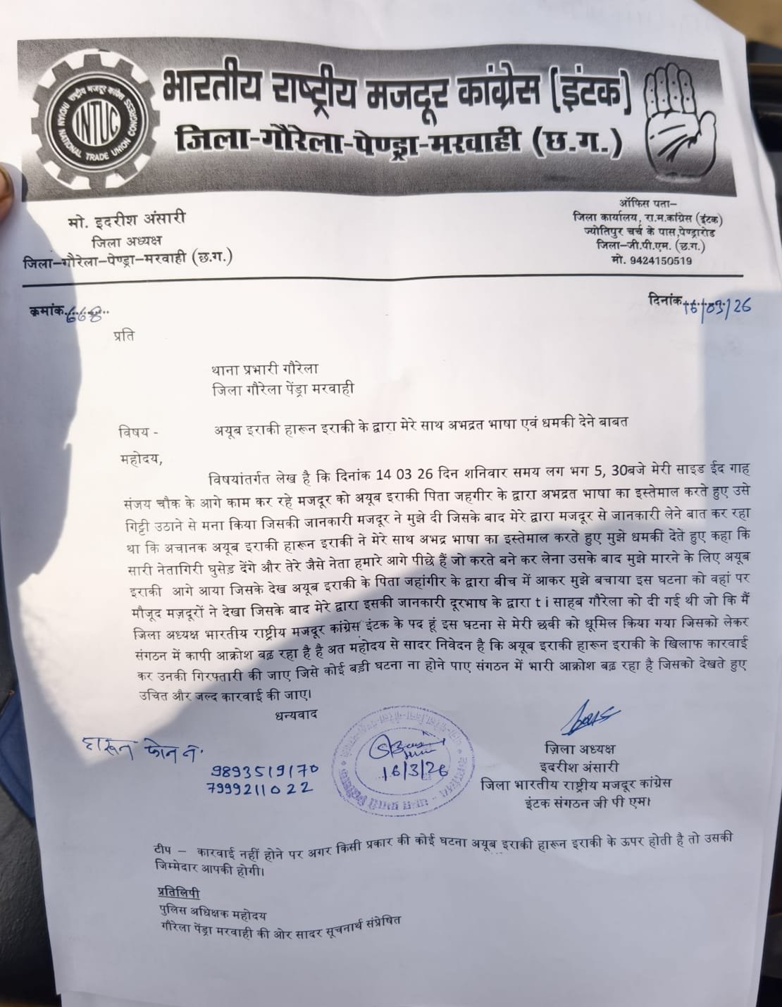 गौरेला पेंड्रा मरवाही जिले के गौरेला थाना में आज इंटक संगठन के पदाधिकारियों और कार्यकर्ताओं ने लिखित शिकायत दर्ज कराते हुए दो व्यक्तियों के खिलाफ सख्त कार्रवाई की मांग की है। शिकायत में आरोप लगाया गया है कि इंटक जिला अध्यक्ष इदरीस अंसारी के साथ अयूब इराकी और हारून इराकी ने अभद्र व्यवहार करते हुए विवाद किया।