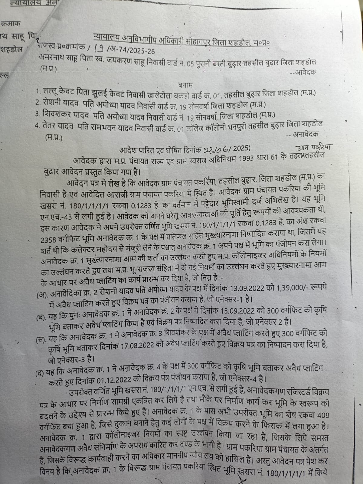 शहडोल। जिले के बुढ़ार तहसील अंतर्गत ग्राम पकरिया से पुश्तैनी जमीन पर अवैध कब्जे, धमकी, फर्जीवाड़े और प्रशासनिक आदेशों की खुलेआम अवमानना का गंभीर मामला सामने आया है। शिकायतकर्ता ने न केवल अवैध कब्जे का आरोप लगाया है, बल्कि यह भी दावा किया है कि एसडीओ सोहागपुर द्वारा जारी किए गए स्थगन आदेश के बावजूद अतिक्रमणकारी निर्माण कार्य बंद करने को तैयार नहीं हैं। यही नहीं, पीड़ित ने यह भी आरोप लगाया है कि बुढ़ार पुलिस आरोपियों को संरक्षण दे रही है, जिसके कारण दबंगों के हौसले और भी बुलंद हैं।