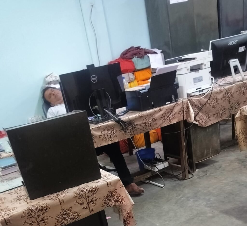 स्थानीय नागरिकों का कहना है कि कार्यालय में काम करने का समय कब आराम में बदल जाता है, यह अब पहचानने लायक नहीं रह गया। फोटो में दिख रहा दृश्य यह बताता है कि कर्मचारियों का विशेष प्रशिक्षण सिर्फ दस्तावेज़ों पर मुहर लगाने तक सीमित नहीं, बल्कि अंगडाई लेने और आराम फरमाने में भी उत्कृष्ट हो गया है।