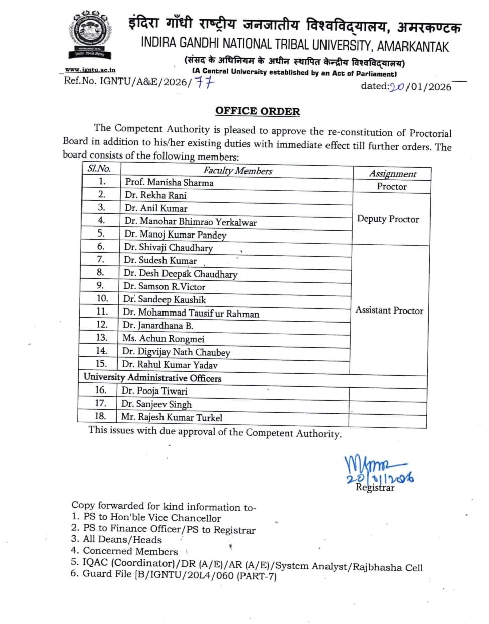 (अरविंद द्विवेदी)अनूपपुर। इंदिरा गांधी जनजातीय विश्वविद्यालय, अमरकंटक में प्रशासनिक स्तर पर बड़ा फेरबदल किया गया है। विश्वविद्यालय प्रशासन ने छात्रावास एवं अनुशासन व्यवस्था को सुदृढ़ करने के उद्देश्य से कुल 28 अधिकारियों को उनके पदों से हटाते हुए नई नियुक्तियां की हैं।