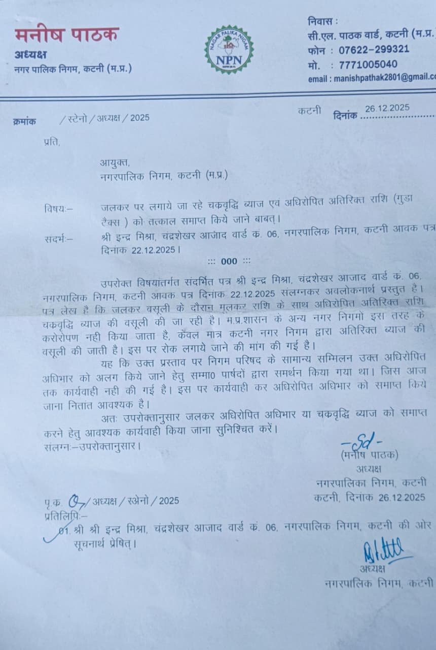 भारतीय जनता युवा मोर्चा के नेता इंद्र मिश्रा का आरोप है कि यदि कोई उपभोक्ता आर्थिक मजबूरी के चलते समय पर जलकर जमा नहीं कर पाता, तो नगर निगम उस पर चक्रवृद्धि ब्याज और भारी पेनल्टी लगाकर वसूली करता है,जो पानी जैसी मूलभूत जरूरत पर सीधा अन्याय है। सबसे बड़ा सवाल यह है कि नगर निगम अध्यक्ष मनीष पाठक द्वारा अधिभार समाप्त करने के निर्देश दिए जाने के बावजूद, अब तक अधिकारियों ने कोई कार्रवाई क्यों नहीं की? क्या प्रशासन जनता की परेशानी को नजरअंदाज कर रहा है? यह सवाल अब कटनी से निकलकर पूरे प्रदेश में गूंजने लगा है।
