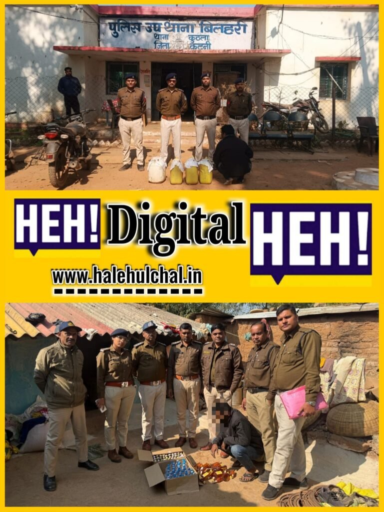 पुलिस अधीक्षक के निर्देश पर अवैध शराब के विरुद्ध चलाए जा रहे अभियान के तहत बिलहरी चौकी पुलिस ने बड़ी सफलता हासिल की है। अतिरिक्त पुलिस अधीक्षक एवं नगर पुलिस अधीक्षक के पर्यवेक्षण तथा थाना प्रभारी कुठला निरीक्षक राजेंद्र मिश्रा के मार्गदर्शन में चौकी प्रभारी बिलहरी उप निरीक्षक सुयश पाण्डेय को मुखबिर से पुख्ता सूचना मिली। सूचना के आधार पर ग्राम कराहिया कला तालाब के पास दबिश दी गई। पुलिस को देखकर भागने की कोशिश कर रहे व्यक्ति को घेराबंदी कर पकड़ा गया। पूछताछ में आरोपी ने अपना नाम अनिकेत लुनिया पिता बलदेव लुनिया 27 वर्ष निवासी ग्राम भिटौनी, थाना माधव नगर बताया। आरोपी के कब्जे से चार डिब्बों में 60 लीटर कच्ची अवैध शराब बरामद की गई, जिसे वह खुलेआम विक्रय के लिए लेकर खड़ा था। आरोपी को गिरफ्तार कर शराब जब्त की गई।