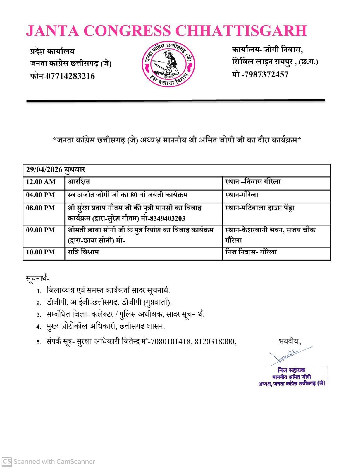 29 अप्रैल को पूर्व मुख्यमंत्री अजीत जोगी का 80 वीं जयंती पर जीपीएम गौरव दिवस मनाया जाएगा अमित जोगी होंगे शामिल।