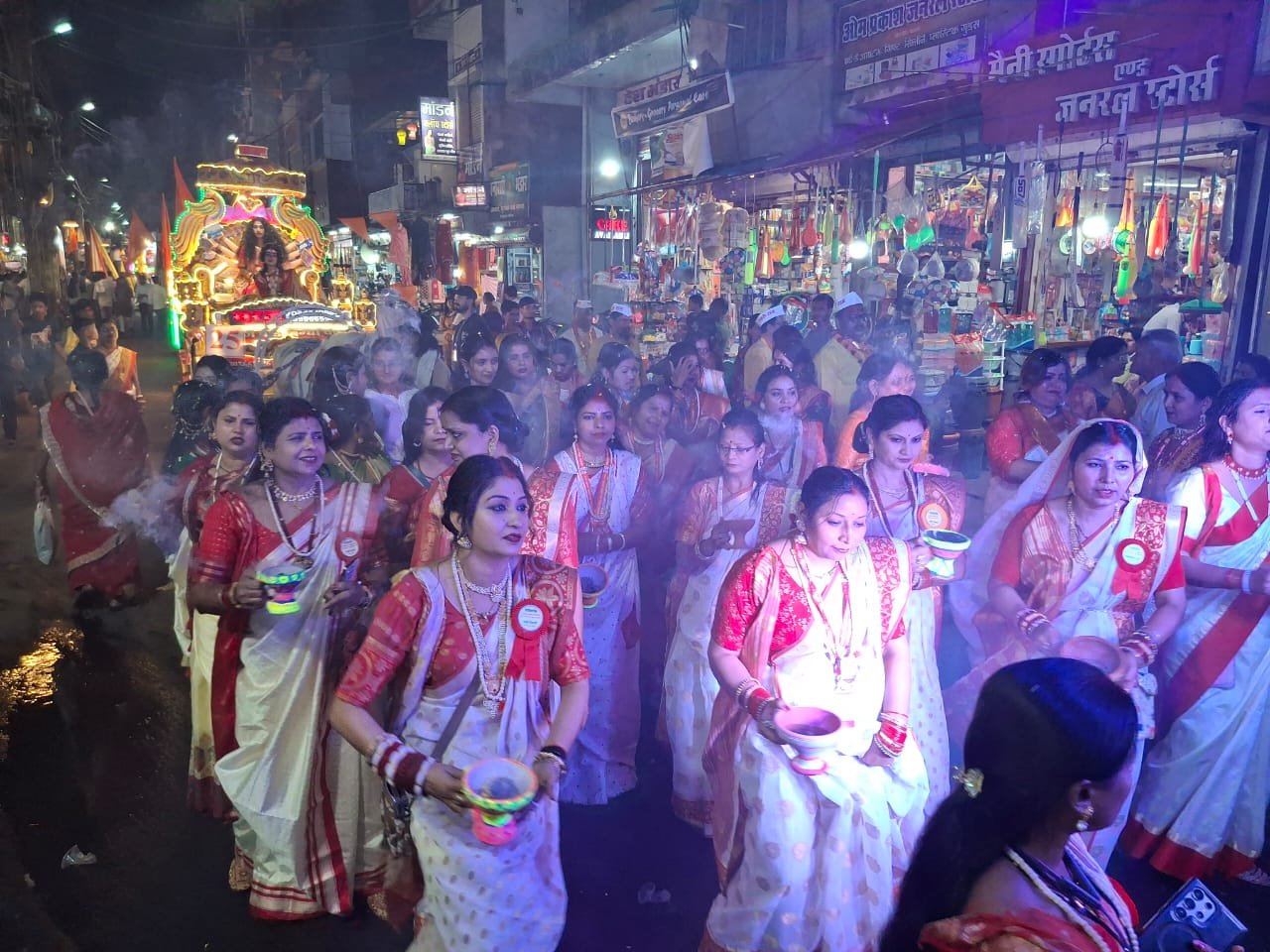 शोभायात्रा का एक विशेष आकर्षण महिलाओं द्वारा प्रस्तुत पारंपरिक खप्पर नृत्य, डांडिया एवं रास रहा, जिसने दर्शकों को मंत्रमुग्ध कर दिया। वहीं डीजे के स्थान पर भजन मंडलियों को प्राथमिकता देते हुए पारंपरिक वाद्य यंत्रों के साथ भक्ति गीतों की प्रस्तुति ने पूरे वातावरण को आध्यात्मिक ऊर्जा से भर दिया। शोभायात्रा घंटाघर से प्रारंभ होकर गर्ग चौराहा, हीरागंज, गोलबाजार, दक्षिणमुखी हनुमान मंदिर, मुख्य मार्ग, सुभाष चौक, कपड़ा बाजार, सराफा बाजार, शेर चौक एवं आजाद चौक होते हुए देर रात गाटरघाट स्थित श्रीराम मंदिर पहुंची। मार्ग में विभिन्न स्थानों पर श्रद्धालुओं द्वारा भगवान श्रीराम की आरती उतारी गई और पुष्प वर्षा कर शोभायात्रा का भव्य स्वागत किया गया। नगर के प्रमुख मार्गों को भगवा ध्वज-पताकाओं से सजाया गया था। श्रद्धालुओं ने अपने-अपने घरों एवं प्रतिष्ठानों के सामने रंगोली सजाकर दीप प्रज्वलित किए और भगवान श्रीराम का स्वागत किया। अनेक स्थानों पर सामाजिक संगठनों द्वारा प्रसाद वितरण एवं जलपान की व्यवस्था भी की गई, जिससे सेवा भाव की सुंदर झलक देखने को मिली। शोभायात्रा का समापन गाटरघाट स्थित श्रीराम मंदिर में भव्य महाआरती के साथ हुआ। महाआरती के समय उपस्थित श्रद्धालुओं ने एक स्वर में जय श्रीराम का उद्घोष कर पूरे वातावरण को भक्तिमय बना दिया। इसके पश्चात प्रसाद वितरण किया गया। पूरे आयोजन के दौरान श्रद्धा, भक्ति और अनुशासन का अद्भुत समन्वय देखने को मिला। रामनवमी के इस पावन पर्व पर निकली यह शोभायात्रा न केवल धार्मिक आस्था का प्रतीक बनी, बल्कि समाज में एकता, संस्कृति और मर्यादा के संदेश को भी सशक्त रूप से प्रसारित कर गई।