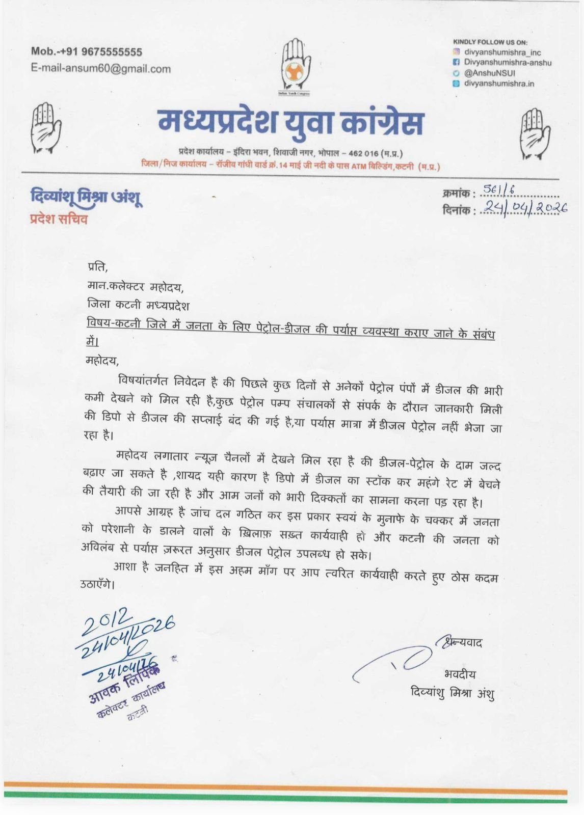कटनी।। जिले में इन दिनों पेट्रोल और डीजल की कमी को लेकर हालात चिंताजनक होते जा रहे हैं। कई पेट्रोल पंपों पर ईंधन की पर्याप्त उपलब्धता नहीं है, जबकि कुछ पंप पूरी तरह ड्राई हो चुके हैं। इस गंभीर स्थिति को लेकर युवा कांग्रेस के प्रदेश सचिव दिव्यांशु मिश्रा अंशु ने कलेक्टर को पत्र लिखकर त्वरित हस्तक्षेप की मांग की है।