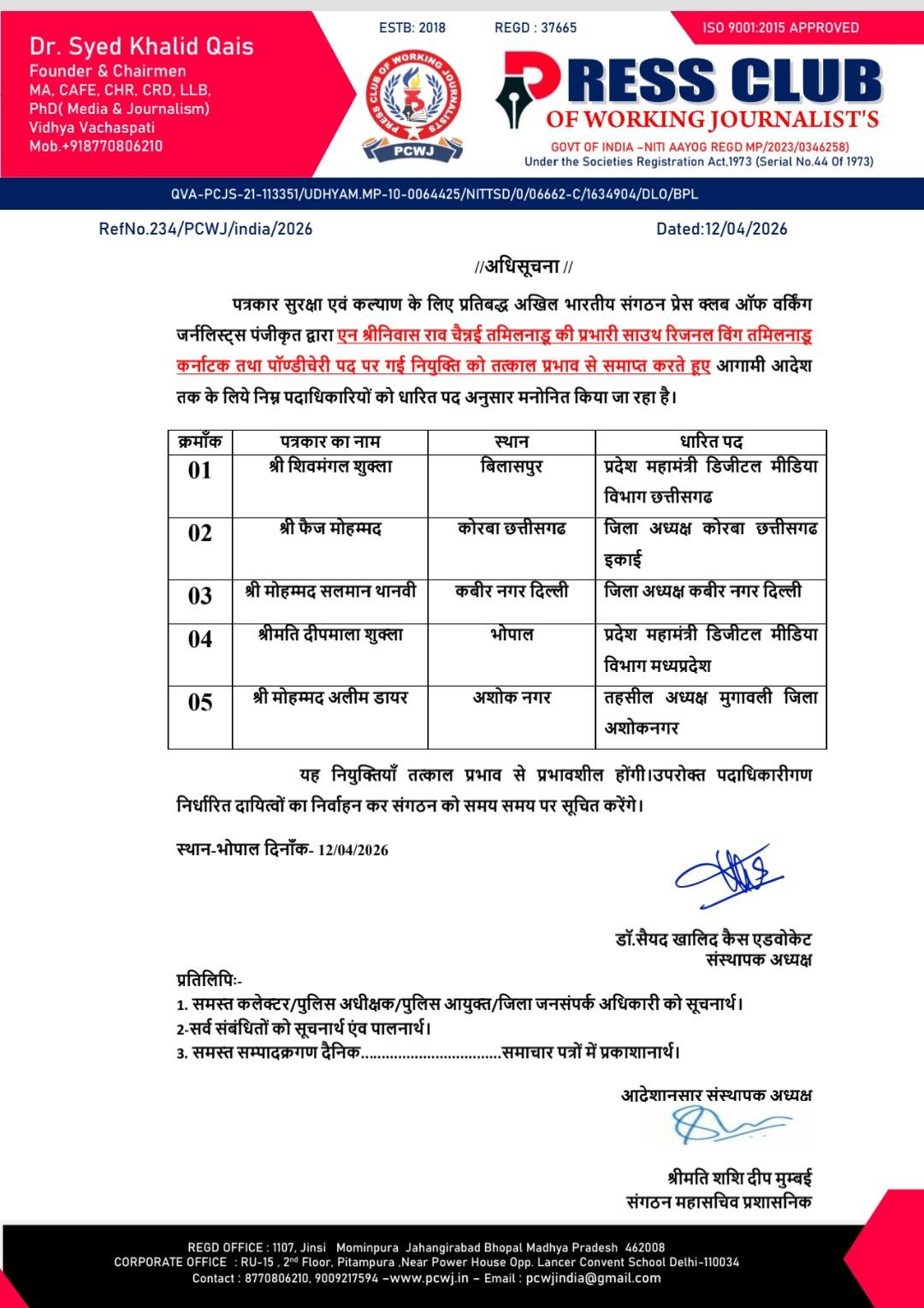 संगठन के संस्थापक एवं अध्यक्ष डॉ. सैयद खालिद कैस एडवोकेट द्वारा रविवार, 12 अप्रैल 2026 को जारी आधिकारिक अधिसूचना (RefNo.234/PCWJ/india/2026) के माध्यम से यह जानकारी दी गई।