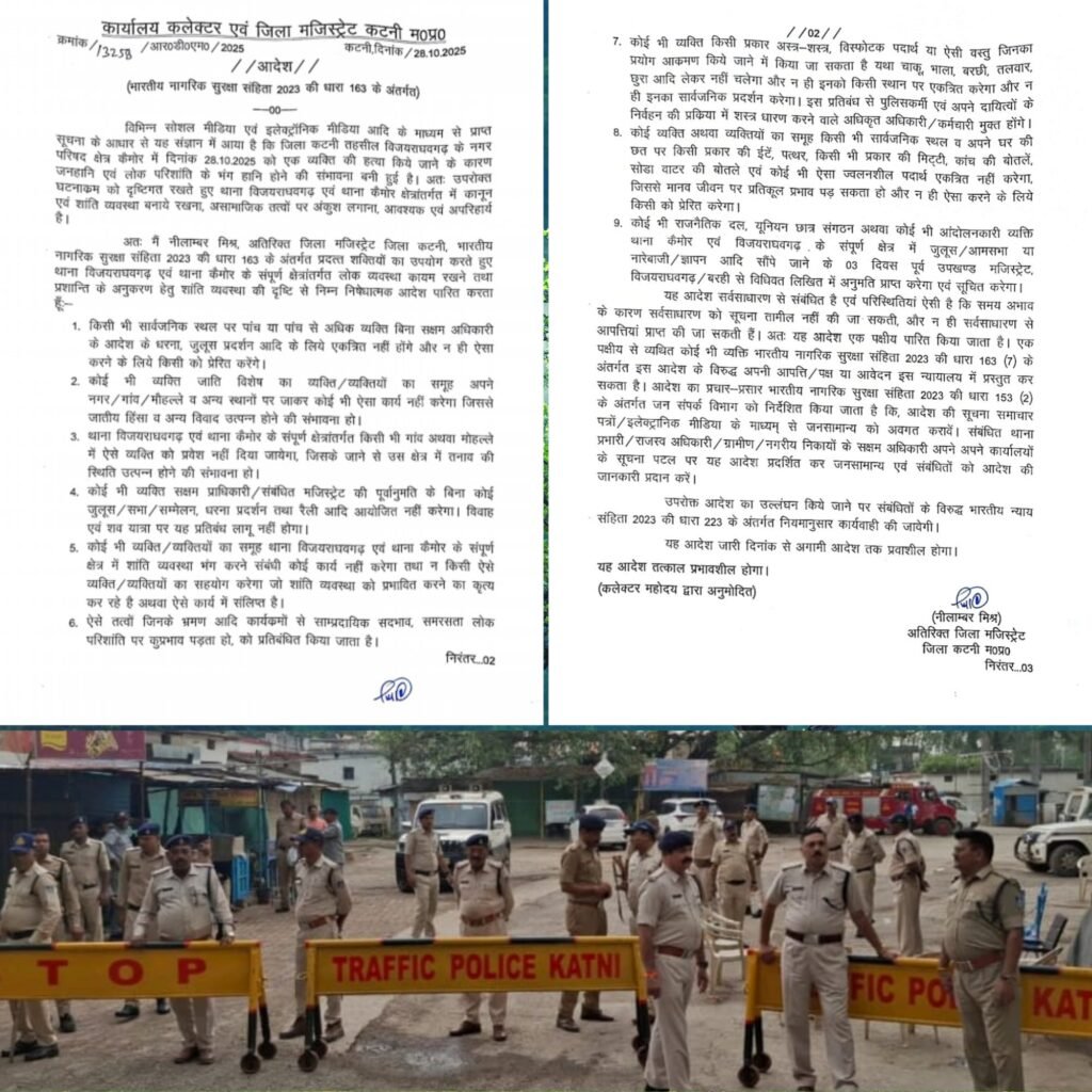 कटनी। जिले के विजयराघवगढ़ एवं कैमोर थाना क्षेत्र में कानून-व्यवस्था बनाए रखने हेतु प्रशासन ने सख्त कदम उठाए हैं। अतिरिक्त जिला मजिस्ट्रेट श्री नीलांबर मिश्र ने भारतीय नागरिक सुरक्षा संहिता 2023 की धारा 163 के तहत निषेधात्मक आदेश जारी किया है। आदेश के अनुसार, बिना पूर्व अनुमति किसी भी प्रकार की सभा, जुलूस, धरना, सम्मेलन या रैली आयोजित नहीं की जा सकेगी।