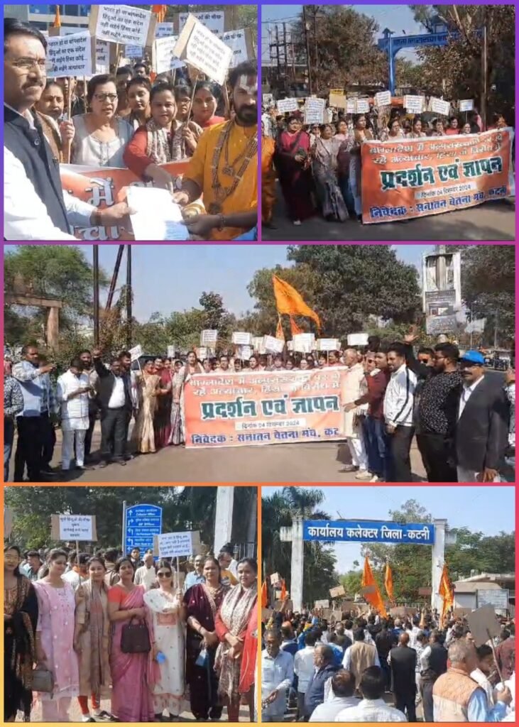 कटनी।। बांग्लादेश में हिंदुओं पर हो रहे अत्याचार के खिलाफ विरोध तेज हो गया है। कटनी में हिंदू रक्षा के आव्हान पर सनातन चेतना मंच के नेतृत्व पर सैकड़ों लोग सड़कों पर उतरे प्रदर्शन में महंत योगी समेत बड़ी संख्या में हिंदू समुदाय के लोग शामिल हुए। प्रदर्शनकारियों ने विश्राम बाबा से प्रदर्शन शुरू कर कलेक्ट्रेट पहुंच मार्गों पर मार्च निकाला। कलेक्ट्रेट मुख्यालय पहुंचकर राष्ट्रपति को संबोधित ज्ञापन कलेक्टर को सौंपा। ज्ञापन में बांग्लादेश में हिंदुओं की सुरक्षा सुनिश्चित करने और अत्याचार बंद कराने के लिए कड़े कदम उठाने की मांग की गई। सनातन चेतना मंच के पदाधिकारियों ने आक्रोश जताते कहा कि बांग्लादेश में हिंदुओं पर हो रहे अमानवीय अत्याचार, मंदिरों को भी निशाना बनाने, महिलाओं पर बलात्कार और घर जलाने की घटनाओं ने पूरे हिंदू समाज को झकझोर दिया है। हिंदू धर्म गुरुओं को जेल में डाला जा रहा है। इन घटनाओं को रोकने के लिए सरकार को कोई ठोस कदम उठाना चाहिए।