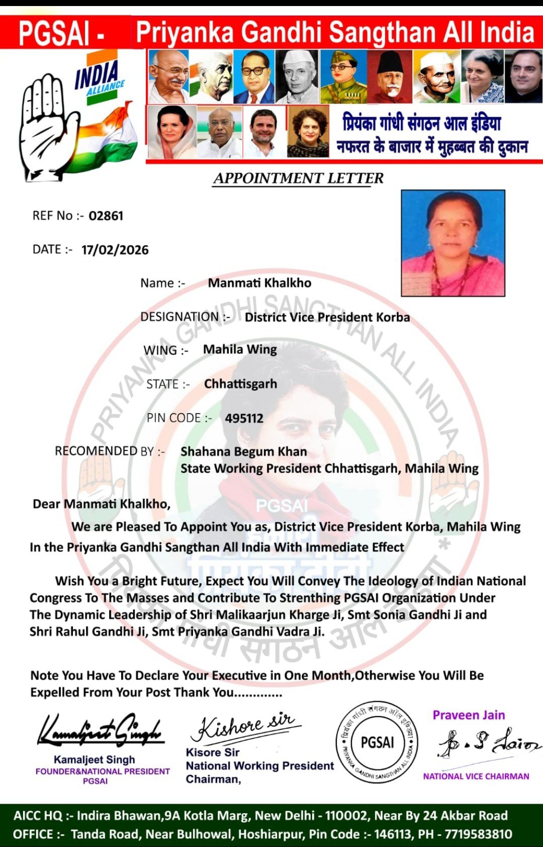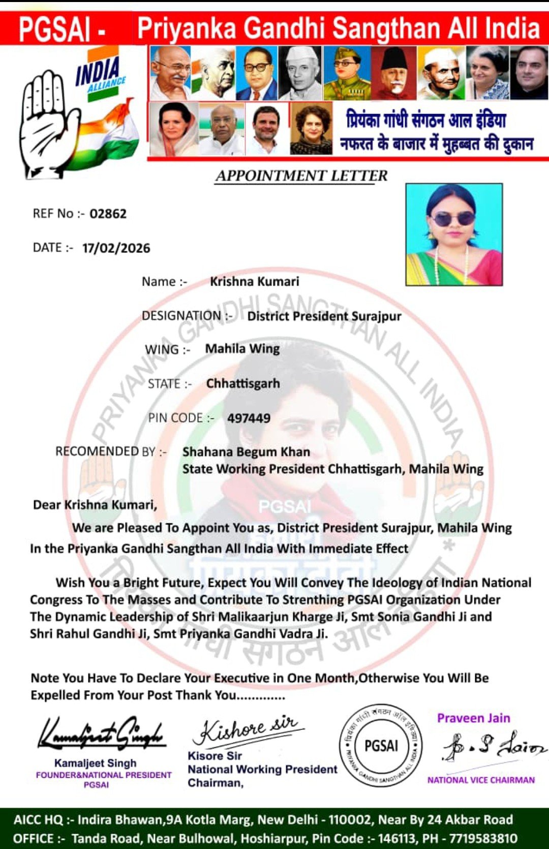 GPM/ गौरेला – प्रियंका गांधी संगठन आल इंडिया के राष्ट्रीय अध्यक्ष कमलजीत सिंह, राष्ट्रीय कार्यकारी अध्यक्ष किशोर सर एवं राष्ट्रीय उपाध्यक्ष प्रविण जैन द्वारा फैज अहमद प्रदेश अध्यक्ष प्रियंका गांधी संगठन आल इंडिया छत्तीसगढ़ राज्य एवं शहाना बेगम प्रदेश अध्यक्ष प्रियंका गांधी संगठन (महिला)आल इंडिया की अनुशंसा पर कृष्णा कुमारी जिलाध्यक्ष सूरजपुर, शबाना बेगम जिलाध्यक्ष बिलासपुर,मानमती खलको जिलाध्यक्ष कोरबा की प्रियंका गांधी महिला संगठन में नियुक्ति की गई है।