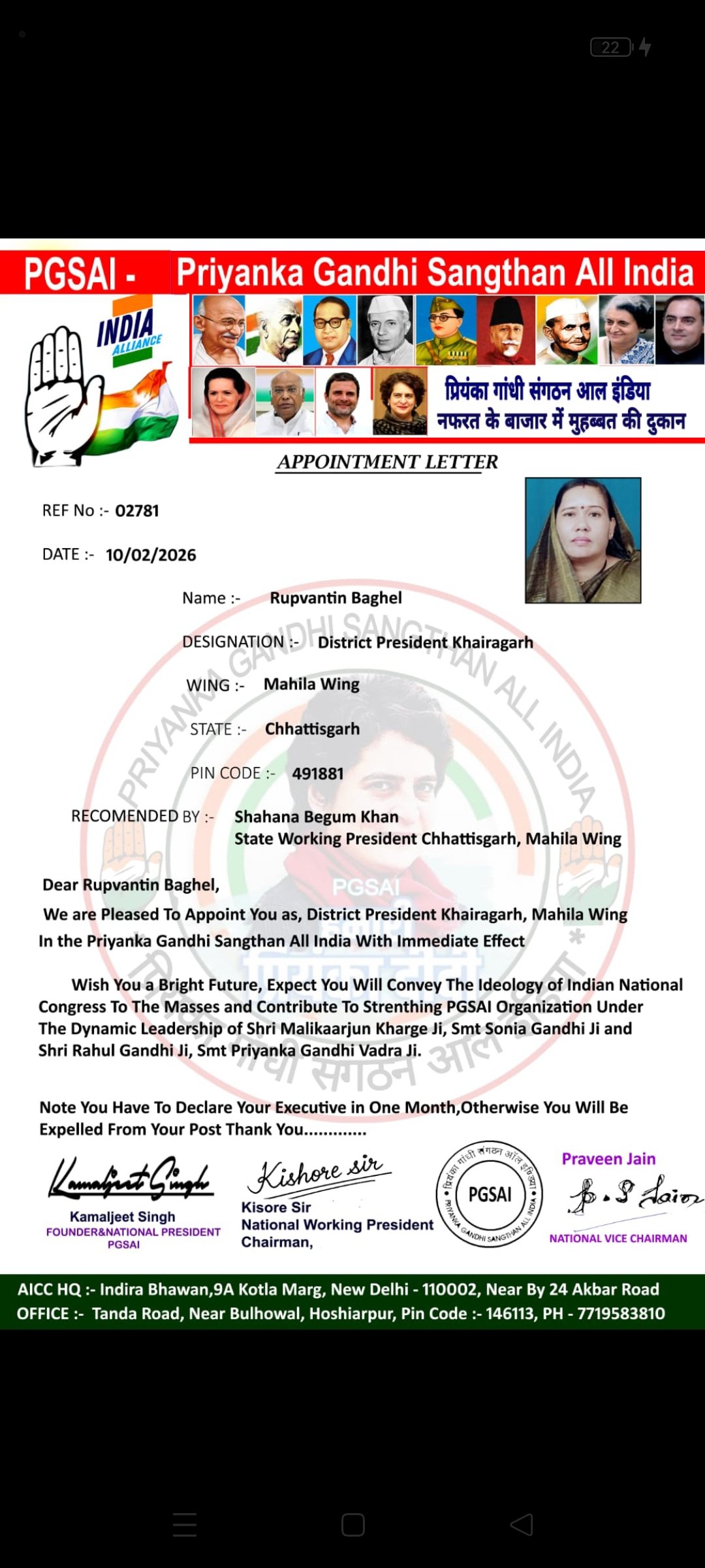 शहाना बेगम प्रदेश अध्यक्ष ने प्रियंका गांधी संगठन में खैरागढ़ एवं कांकेर जिलाध्यक्ष की नियुक्ति की।
