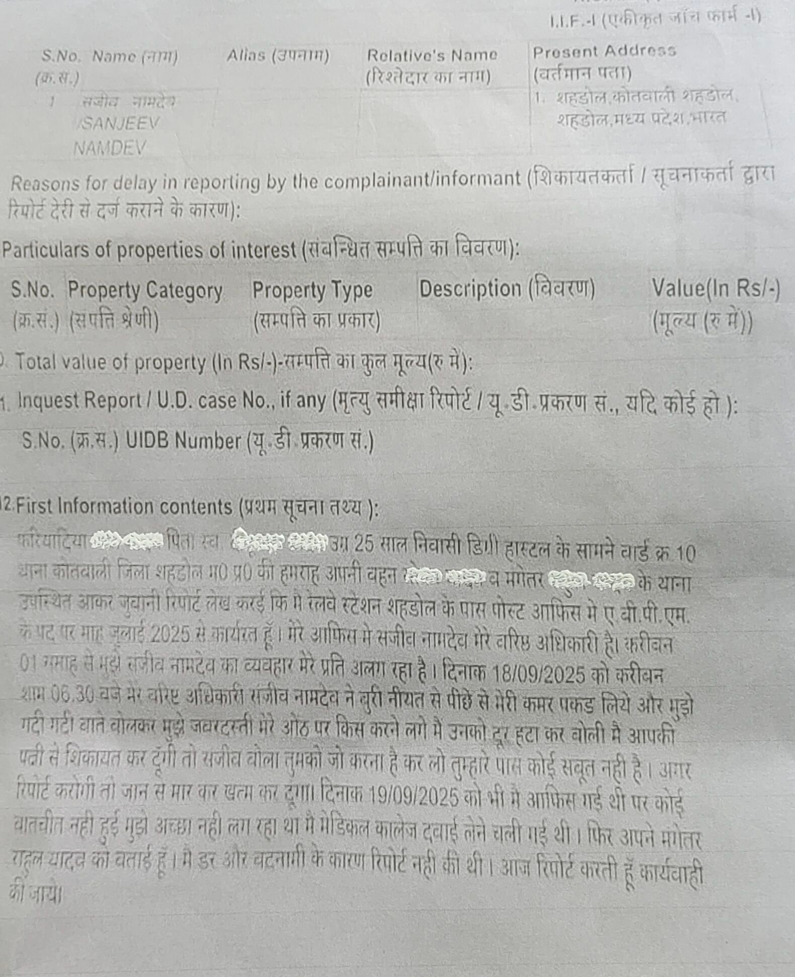 18 सितम्बर 2025 की शाम करीब 6:30 बजे डाकघर में ड्यूटी के दौरान पी.ए. संजीव नामदेव ने महिला कर्मचारी से न सिर्फ अभद्र हरकत की, बल्कि विरोध करने पर जान से मारने, बदनाम करने और नौकरी से निलंबित कराने जैसी धमकियां भी दीं। महिला कर्मचारी ने इस संबंध में डाक अधीक्षक को लिखित शिकायत दी, लेकिन कार्रवाई का नतीजा और भी हैरान करने वाला निकला— आरोपी को बचाने और महिला को कमजोर साबित करने के लिए उसका षड्यंत्रपूर्वक ट्रांसफर कर दिया गया।