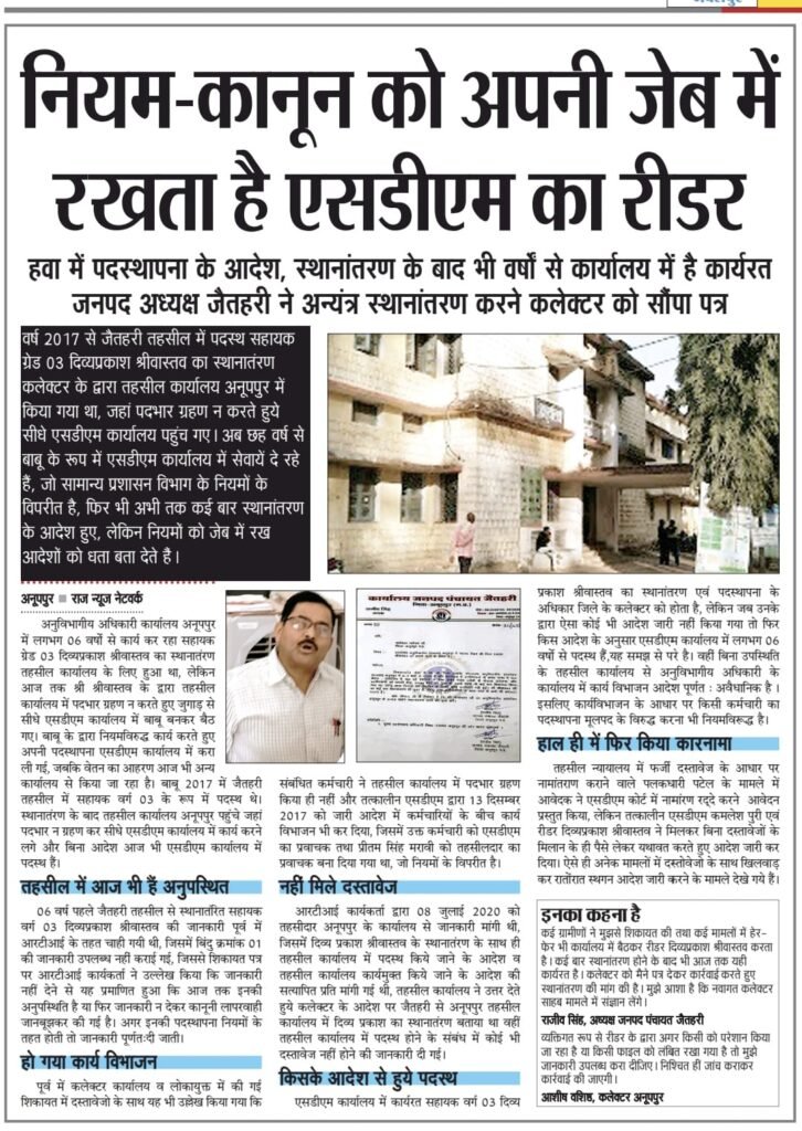 स्थानांतरण के बाद भी बाबू मुख्यालय में जमा हुआ है जल्द ही श्रीवास्तव बाबू को पद मुक्त नहीं किया जाता तो तहसील का घेराव कर उग्र आंदोलन किया जाएगा जिसकी सारी जवाबदारी अनूपपुर एसडीएम की होगी।