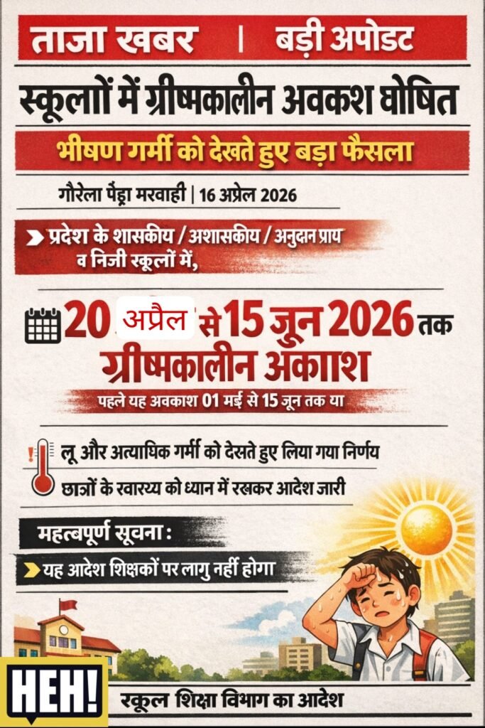 गौरेला पेंड्रा मरवाही, 16 अप्रैल 2026/ स्कूल शिक्षा विभाग द्वारा 22 सितंबर 2025 को जारी आदेश के अनुसार शासकीय, अनुदान प्राप्त, गैर अनुदान प्राप्त शालाओं में दिनांक 01 मई से 15 जून 2026 तक ग्रीष्मकालीन अवकाश घोषित किया गया था। वर्तमान में प्रदेश में पड़ रही भीषण गर्मी व लू के कारण छात्रों के स्वास्थ्य पर पड़ने वाले प्रतिकूल प्रभाव की आशंका को दृष्टिगत रखते हुये, राज्य शासन एतद् द्वारा प्रदेश के समस्त शासकीय, अनुदान प्राप्त, गैर अनुदान प्राप्त, अशासकीय शालाओं हेतु घोषित ग्रीष्मकालीन अवकाश में आंशिक संशोधन करते हुये अब 20 अप्रैल से 15 जून 2026 तक ग्रीष्मकालीन अवकाश घोषित किया गया है।