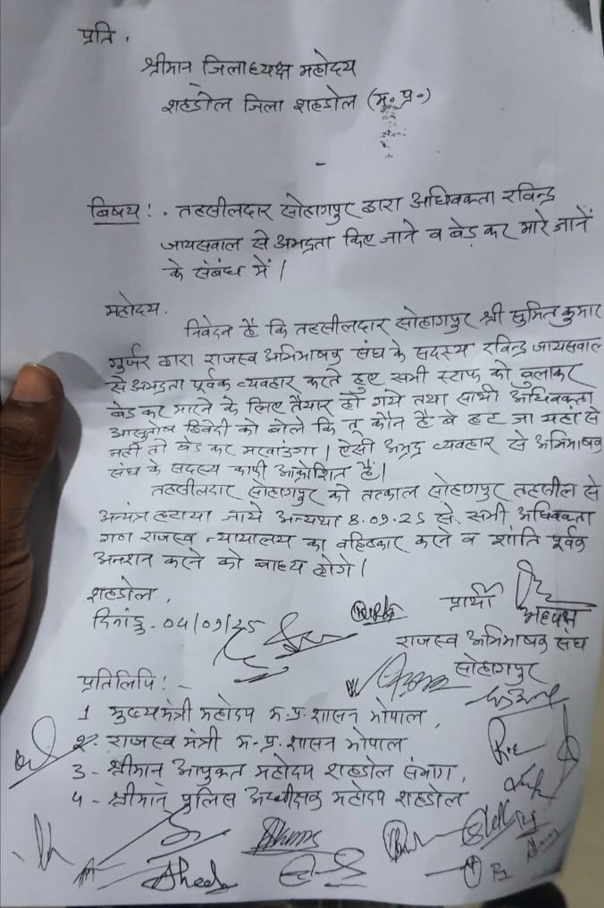 राजस्व अभिभाषक संघ सोहागपुर द्वारा जारी ज्ञापन के अनुसार, तहसीलदार गुर्जर ने गुरुवार को अधिवक्ता रविन्द्र जायसवाल से न केवल अपमानजनक भाषा का प्रयोग किया बल्कि कार्यालय के समस्त स्टाफ को बुलाकर “बेड़ कर मारो” जैसी आपत्तिजनक बात कही। इतना ही नहीं, मौके पर उपस्थित अधिवक्ता आशीष द्विवेदी को भी हट जाने की धमकी देते हुए कहा गया कि यदि वह नहीं हटे तो उन्हें भी “बेड़ कर मरवाया जाएगा”। इस तरह की कथित धमकी और व्यवहार ने वकीलों को स्तब्ध कर दिया।