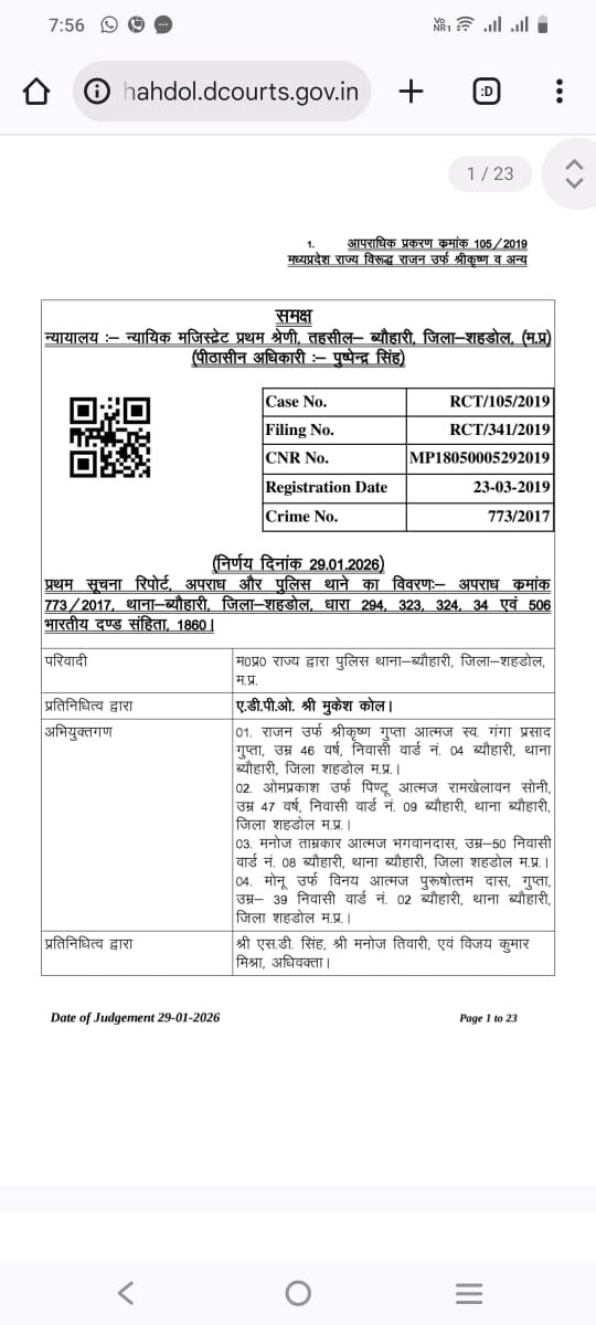 शहडोल/ब्यौहारी। न्यायिक मजिस्ट्रेट प्रथम श्रेणी, ब्यौहारी (जिला शहडोल) की अदालत ने बहुचर्चित आपराधिक प्रकरण क्रमांक 105/2019 में महत्वपूर्ण फैसला सुनाते हुए ब्यौहारी नगर पालिका अध्यक्ष राजन उर्फ श्रीकृष्ण गुप्ता, वर्तमान मंडल अध्यक्ष मोनू उर्फ विनय गुप्ता, पूर्व मंडल अध्यक्ष ओमप्रकाश उर्फ पिंकू सोनी तथा कारोबारी मनोज ताम्रकार को दोषी करार देते हुए सजा सुनाई है। निर्णय दिनांक 29 जनवरी 2026 को घोषित किया गया। मामला मारपीट, अश्लील गाली-गलौज, चोट पहुंचाने और जान से मारने की धमकी से जुड़ा है।