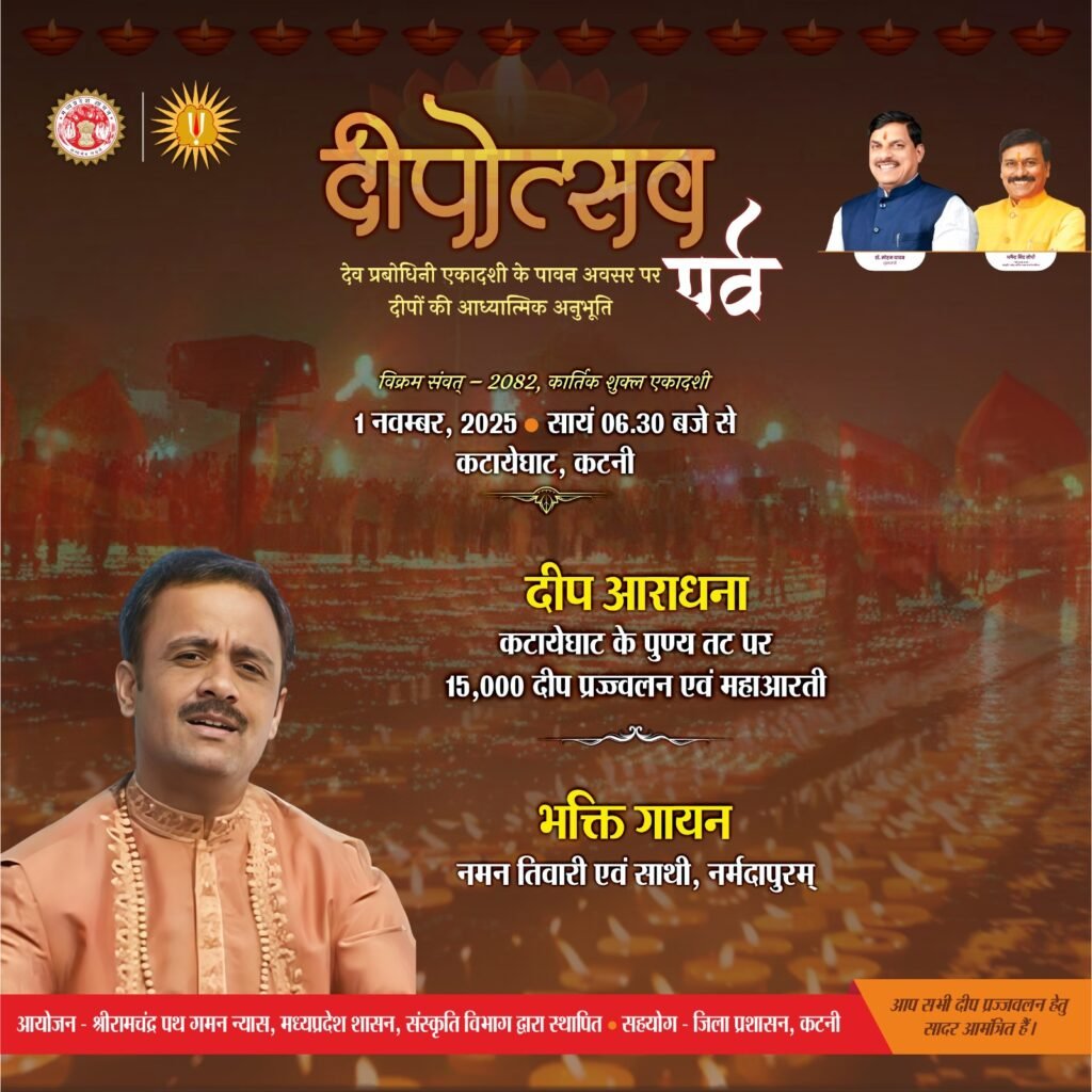 कटनी।। देव प्रबोधिनी एकादशी के अवसर पर 1 नवंबर, 2025, विक्रम संवत् – 2082, कार्तिक शुक्ल एकादशी पर सायं दीपोत्सव पर्व-2025 के तहत कटनी के कटायेघाट में 15 हजार दीप प्रज्ज्वलन एवं 5 पंडितों द्वारा महाआरती की जायेगी। इन दीपों से श्रीरामचंद्र जी, माता सीता जी, माँ नर्मदा मैया, माँ मंदाकिनी मैया की दीप आराधना की जाएगी। संयुक्त कलेक्टर जितेन्द्र पटेल ने बताया कि दीप प्रज्ज्वलन के साथ ही भक्ति संगीत संध्या का आयोजन भी किया जाएगा। भक्ति संगीत संध्या में शनिवार की शाम 6:30 बजे कटायेघाट में ख्यातिलब्ध कलाकार एवं नर्मदापुरम के भक्ति गायक नमन तिवारी एवं साथी भाग लेंगे। यह आयोजन श्रीरामचन्द्र पथ गमन न्यास, संस्कृति विभाग और जिला प्रशासन के सहयोग से संयोजित किया जाएगा।