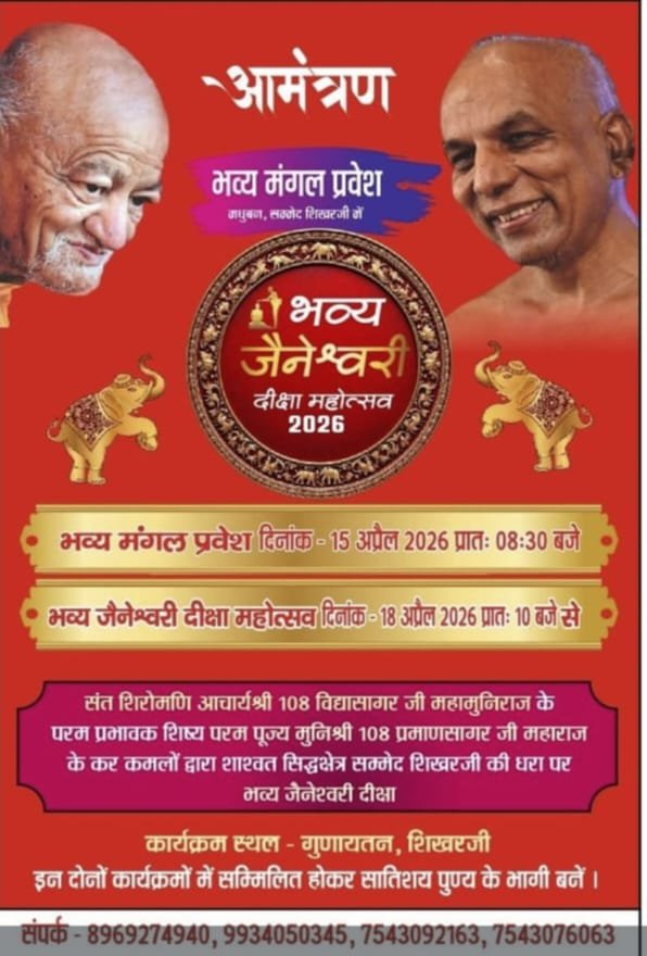 शहडोल। जैन धर्म की तपस्या, त्याग और संयम की महान परंपरा का ऐतिहासिक क्षण अब समीप है। झारखंड के विश्वविख्यात सिद्धक्षेत्र श्री सम्मेदशिखर जी में 18 अप्रैल को भव्य जैनेश्वरी दीक्षा महोत्सव आयोजित होगा। यह आयोजन संत शिरोमणि आचार्य विद्यासागर जी के प्रभावक शिष्य मुनि प्रमाणसागर महाराज के सान्निध्य में संपन्न होगा।यह महोत्सव केवल धार्मिक अनुष्ठान नहीं, बल्कि आत्मजागरण, वैराग्य और मोक्षमार्ग की ओर प्रेरित करने वाला आध्यात्मिक पर्व होगा, जिसमें साधक सांसारिक मोह-माया का त्याग कर संयम जीवन को अपनाएंगे।