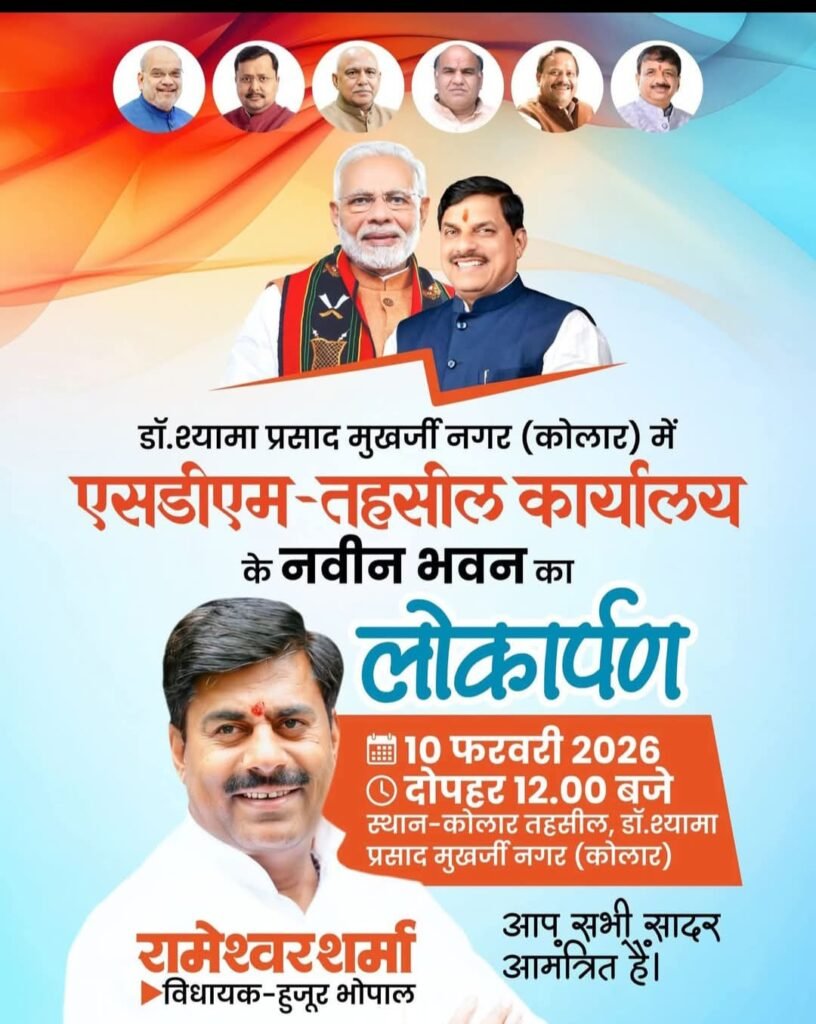 भोपाल। राजधानी के तेजी से विकसित हो रहे कोलार क्षेत्र को आज एक महत्वपूर्ण प्रशासनिक सौगात मिलने जा रही है। डॉ. श्यामा प्रसाद मुखर्जी नगर (कोलार) में एसडीएम–तहसील कार्यालय के नवीन भवन का लोकार्पण आज 10 फरवरी को दोपहर 12 बजे किया जाएगा। इस भवन के शुरू होने से क्षेत्र के हजारों नागरिकों को राजस्व और प्रशासनिक सेवाएं स्थानीय स्तर पर ही उपलब्ध हो सकेंगी।